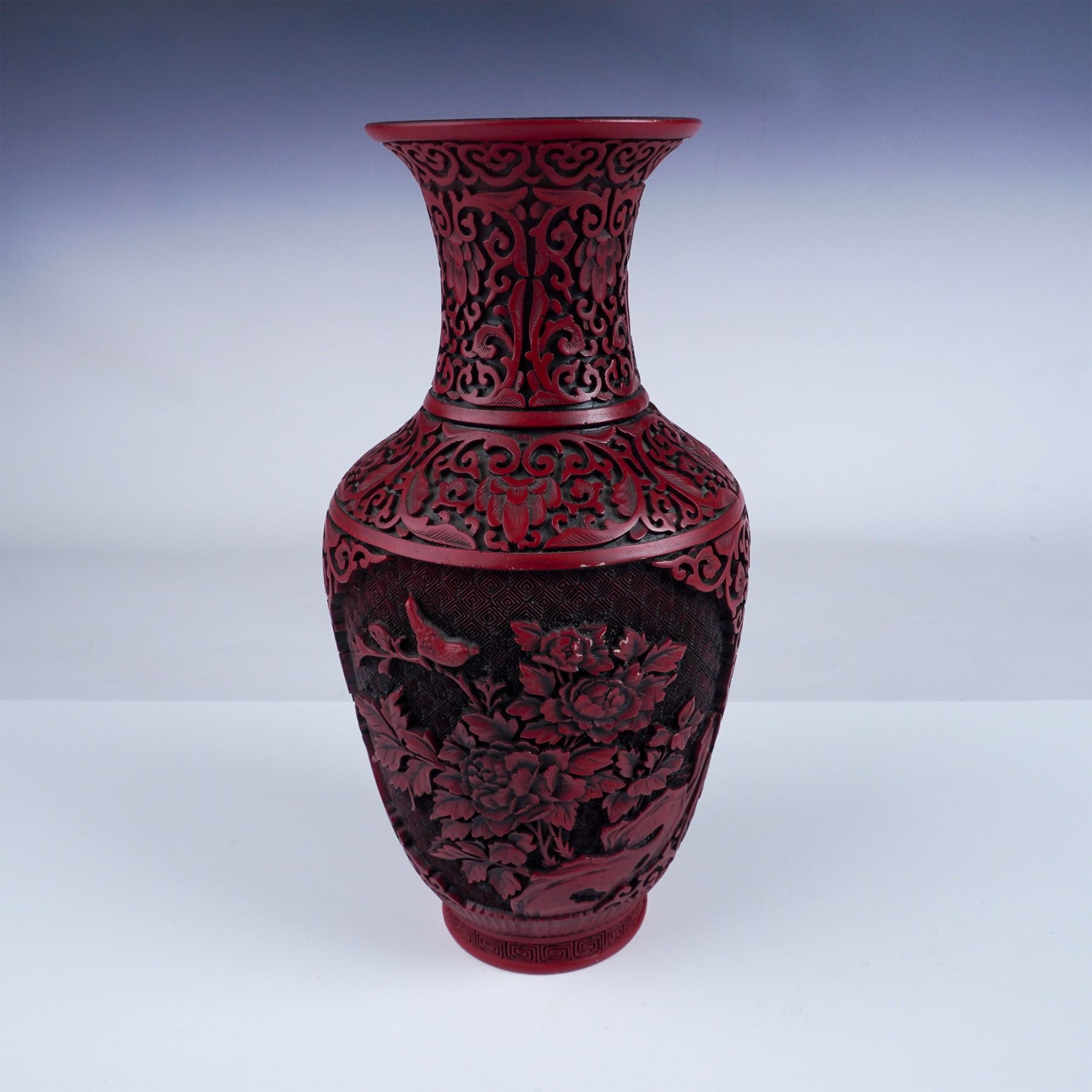 Beautiful cinnabar lacquer vase featuring intricate hand-carved floral designs with a striking red and black motif. The vase is 11.5"H and has a gold-toned interior and base, adding an elegant contrast to the richly detailed exterior. The base bears a Chinese hallmark, confirming its craftsmanship. A fine example of traditional Chinese artistry, this vase is a timeless decorative piece for any collector or enthusiast.
