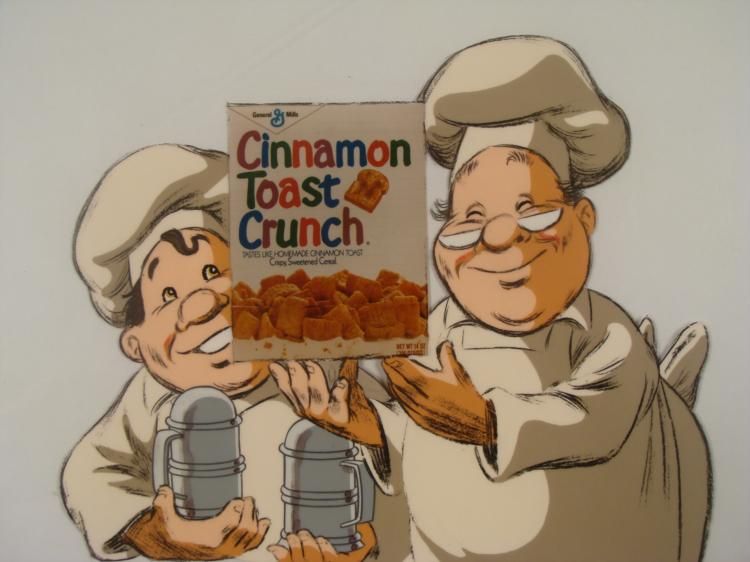 Here is an original animation cel and drawing, both used in the production of a Cinnamon Toast Crunch cereal commercial. These three bakers were the original mascots of the cereal, and they first appeared in the late 1980's. The cereal box they re holding up is actually a printed photo of an actual box. The drawing is a shadow drawing, showing where the shadows go. * * Medium: Hand-inked and hand-painted acetate cel with photo; red and blue pencil on animator's paper with notationsImage size: 11 1/4 x 9 inchesPaper sheet size: 12 1/2 x 10 1/2 inchesPresentation: Double matted in pink and whiteMatte size: 20 x 16 inchesCondition: Excellent; sealed in cellophane