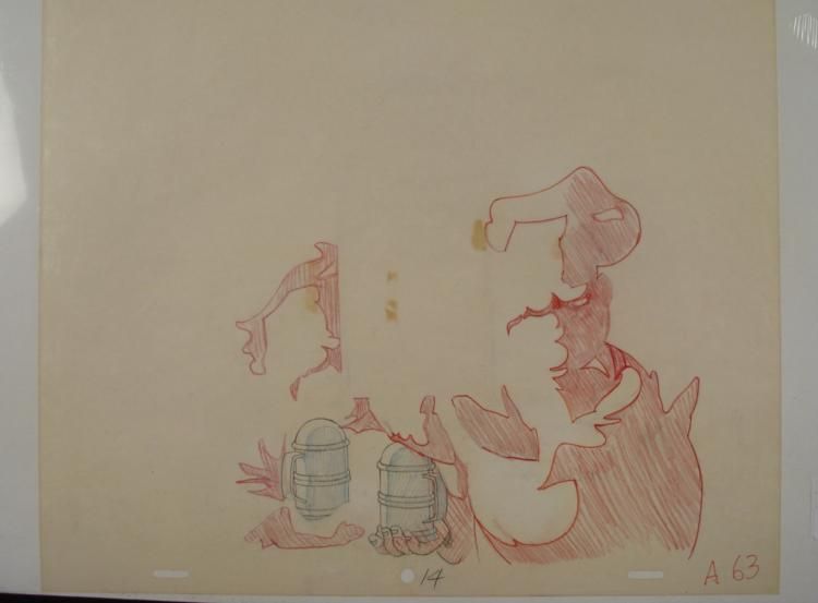 Here is an original animation cel and drawing, both used in the production of a Cinnamon Toast Crunch cereal commercial. These three bakers were the original mascots of the cereal, and they first appeared in the late 1980's. The cereal box they re holding up is actually a printed photo of an actual box. The drawing is a shadow drawing, showing where the shadows go.Medium: Hand-inked and hand-painted acetate cel with photo; red and blue pencil on animator's paper with notationsImage size: 11 1/4 x 9 inchesPaper sheet size: 12 1/2 x 10 1/2 inchesPresentation: Double matted in pink and whiteMatte size: 20 x 16 inchesCondition: Excellent; sealed in cellophane