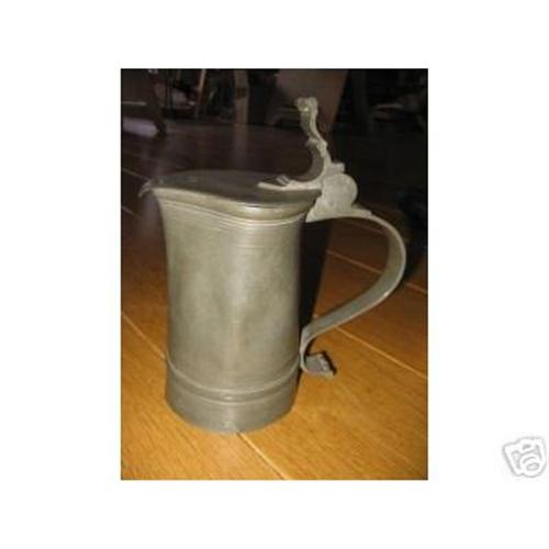 This is a nice hallmarked petwer stein. It has a nice lid with the initials IM on it. The handle has two hallmarks on it showing it was made in Strassburg 1776-1805. The bottom has a tudor Rose design. The jug measures 14 cm tall. It has a little body dinging. The base seam has come a little seperated.The Tudor Rose on the base has wear on the highlights. This is overall a very nice stein. Buyer pays $22.50 standard airmail postage (2 weeks) from EUROPE.