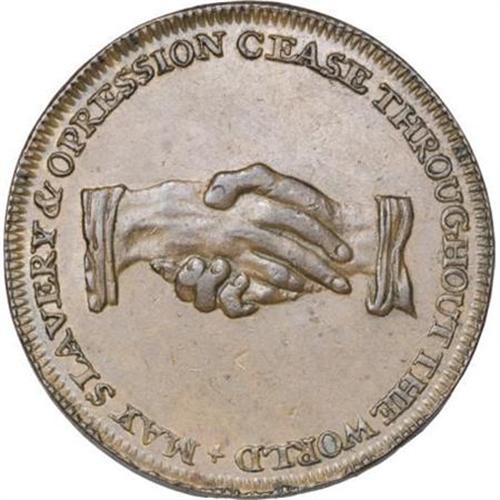 <B>Circa 1790s Antislavery British Conder Token.</B></I> D&H-1037. Copper. Late 18th century British antislavery Conder token halfpenny Payable in Dublin or London <B>"Am I Not A Man And A Brother." </B></I> Though this is not a Hard Times token it does fall into the general category due to the design, which is similar to HT-82. This nice chocolate-brown piece would fit nicely into one's collection.<BR><BR><b>Shipping:</b> Coins & Currency (<a target="_blank" href="http://www.heritageauctions.com/common/shipping.php">view shipping information</a>)