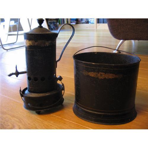 This is a nice coffe/tea pot set. It dates to the first half of the 19th century. The coffee pot is designed with a small drawer on the base to hold hot coals to keep the coffee/tea warm. It comes with both handled buckets to carry and keep it on the table. It has some design on it. The piece is in good condition but shows age and has a small dent on the front. It is made out of a thinn tin type material. Just needs a good cleaning. A nice set.