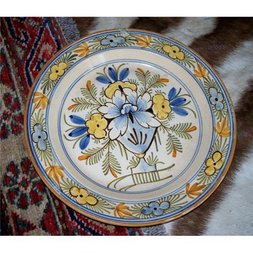 Here we have a fine early creamware plate in a flower basket motif. The colors and design of this plate are similar to delftware pieces of the same period. On a cream ground, the colors are ochre, blue and sage green. The condition is very fine. There are a few gaps in the glaze along the edge and a smudge under the glaze on the edge, all of which appear to be in the making. The underside has a peppery looking discoloration in places. No cracks, chips or repairs. 9" in diameter.