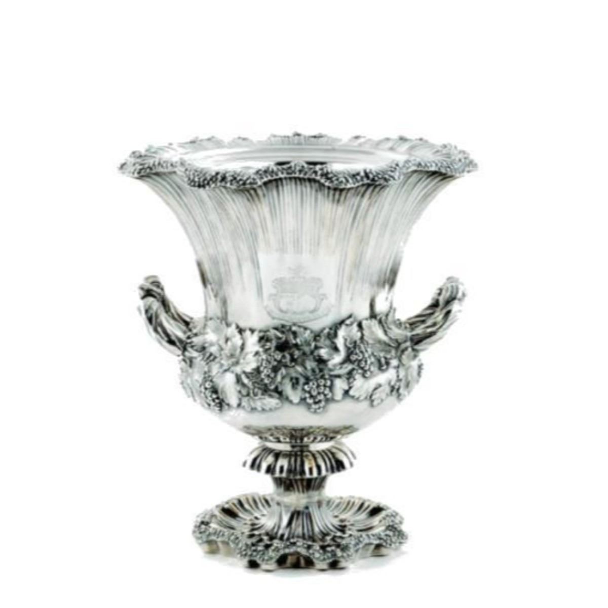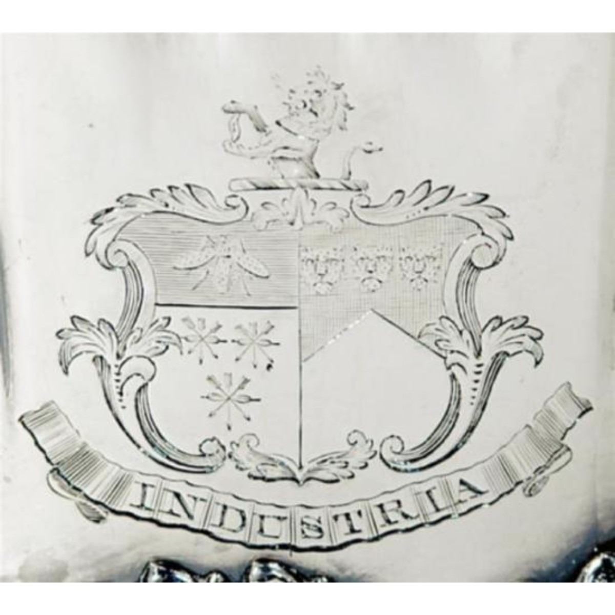 Georgian Old Sheffield fused plate cooler, circa 1800. Ruffled rim formed of sheaves bound by grapevines, with twist handles. Unidentified let in arms, possibly of the Abney family with motto INDUSTRIA; undersidemarked with crown punch. 11 1/2" H.