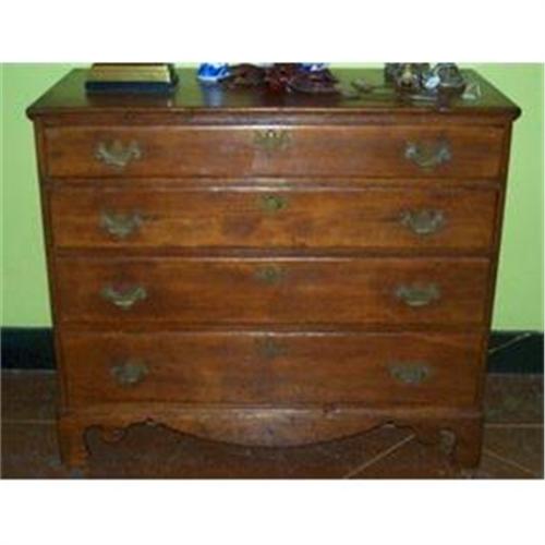 Offered here is a wonderful, early pine chest having 4 graduated drawers, bracket feet and a beautiful warm patina. The brasses are newer, I believe the feet are original, but I believe the apron is not. Three corners of the bottom drawer have been replaced. The chest measures 43" across, is 20" deep and 37" high.