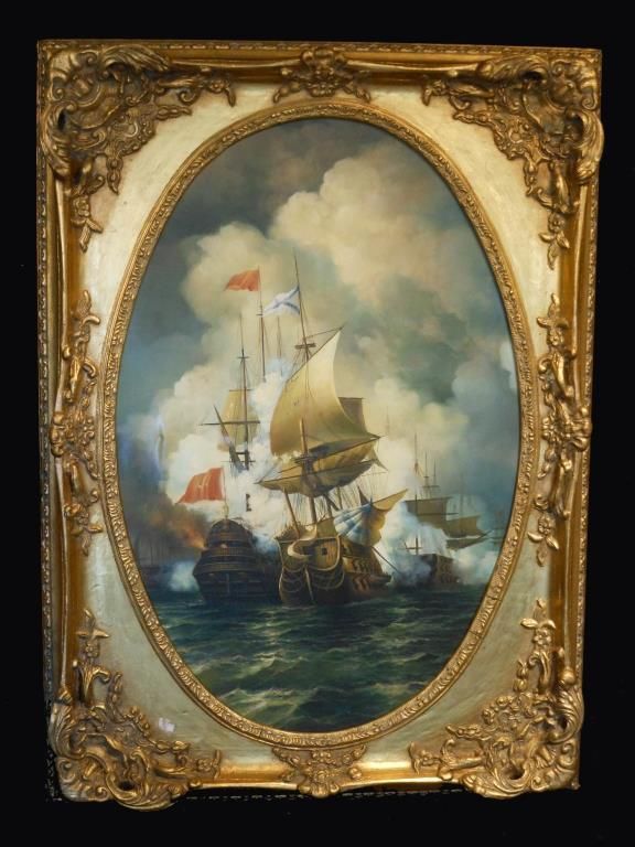 British School Naval Battle Scene Oil On Canvas. Overall Dimensions: Frame 104 x 82 canvas oval: 89 x 58.