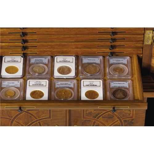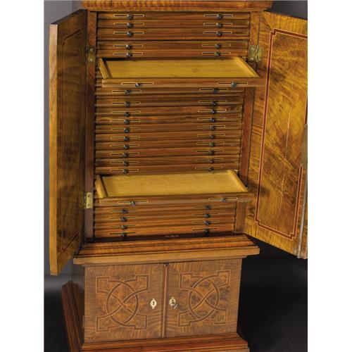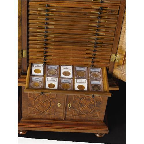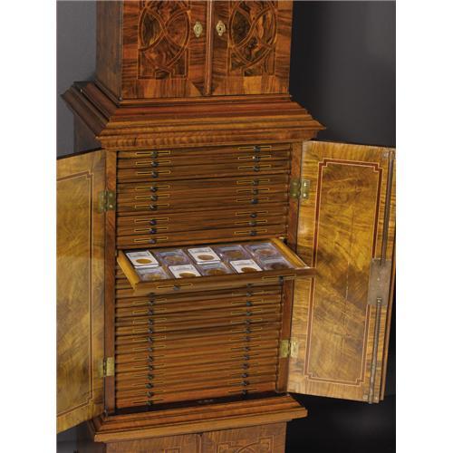 <B>Circa 1820 Collector's Specimen Cabinet.</B></I> A fine English Regency veneered cabinet of elegant classical tripartite form, the upper section surmounted by a sweeping pediment with a secret compartment, above two doors with intricately designed stinging and bands inlaid against a burl walnut veneer, opening to an expertly crafted and fitted interior with 18 bowed and inlaid trays, the doors with inlaid geometric bands; all above a cornice and larger conforming mid-section with 26 trays, over a squat open storage space, all supported on bun feet; all sections with individual locks and keys.<BR><BR><B>Dimensions:</B></I> 60-1/2 x 19-1/4 x 16-1/4 inches.<BR><BR><B>Condition:</B></I> minor cracks in the lower left door, a long 17-3/4 inch crack in the right middle door, and with a loss to the trim around the top.<BR><BR><B>Commentary:</B></I> Similar cabinets are historical reminders of early American and European collecting activities, predating coin boards, coin albums, or the certified coin holders of today. All coin collectors of stature had their own cabinet to house their collection, and these were popular until at least the late 1920s. Page 71 of Q. David Bowers' <I>The History of United States Coinage As Illustrated by the Garrett Collection</B></I> shows a photo of John Work Garrett seated in front of his magnificent cabinet, examining an item from his collection. A single cabinet tray is extended, showing the fittings that are an integral part of these pieces.<BR><BR>Coin cabinets spawned a special numismatic term that is seldom heard today. The <I>Coin World Almanac</B></I> defines "Cabinet Friction" as "Slight surface wear on a coin, token, or medal caused by friction between it and the tray or envelope in which it is contained."<BR><BR>Over a number of years during the late 19th century and early 20th century, advertisements in <I>The Numismatist</B></I> and other publications offered various size cabinets for sale. In one instance, Farran Zerbe offered a coin cabinet in the form of a metal safe fitted with trays. A small, portable cabinet was offered by H. Gerstner & Sons of Dayton, Ohio: "A cabinet adaptable to your needs. A necessity for the man desiring orderly arrangement of his coins." The firm's advertisement, from an unknown source, was reprinted in <I>The History of United States Coinage.</B></I><BR><BR>While this particular cabinet is not offered as a coin cabinet, it is important to consider that it would actually serve a variety of small collectibles, including items such as autographs, manuscripts, sports cards, antique jewelry, or nearly any other similar small item. As suggested in the accompanying photos, this cabinet is also perfectly suited to house today's modern coin certification holders.<BR><BR><b>Shipping:</b> Requires 3rd Party Shipping (<a target="_blank" href="http://www.heritageauctions.com/common/shipping.php">view shipping information</a>)