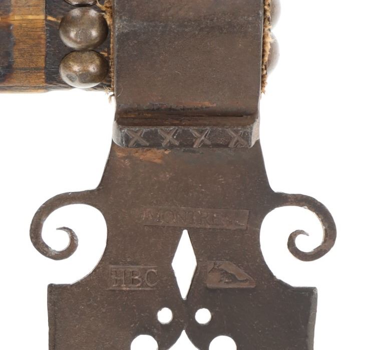 This is a fantastic circa 1850-1860’s spontoon pipe tomahawk. The design and style lean itself towards being from the Central Plains origin. The piece exhibits a hand-forged iron spontoon pattern trade head that is stamped HBC MONTREAL with a sitting fox touchmark / hallmark. This refers to the Hudson’s Bay Company. The spontoon double edge blade shows two impressive under-curled basal processes along with a weeping heart cut out at the center as well as a slight median ridge running along the center of the blade on both sides, an early documented weapons feature. The head is on an early hard ash wood haft with extensive hot file branding and a few brass trade tacks. The tomahawk exhibits a deep, shiny patina with minor wear. Truly a work of art piece being well kept with unusual scarce touchmark. Provenance: From a large weapons and beadwork collection in Indiana. The head measures 10 ½ inches long and overall 23 ½ inches long.