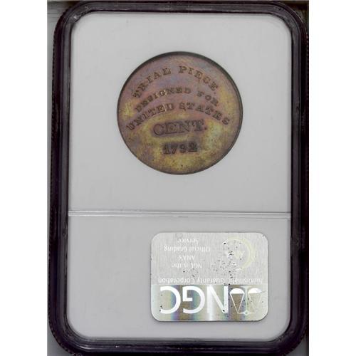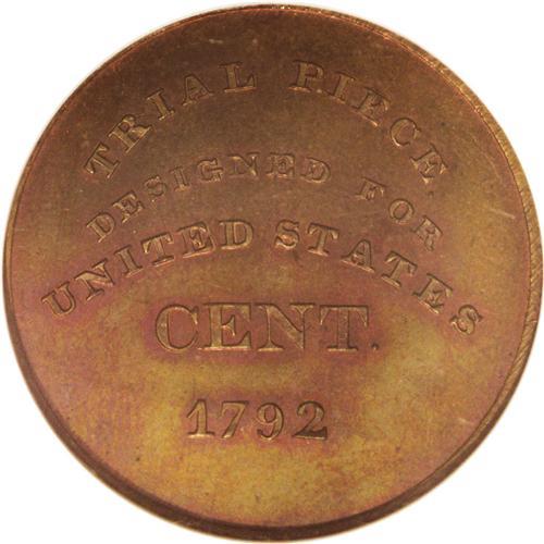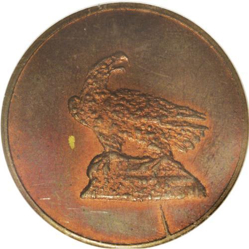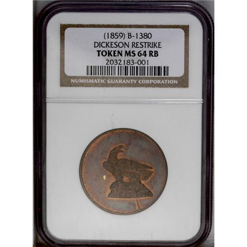<B>Circa 1859 Dickeson Restrike Token MS64 Red and Brown NGC.</B></I> Breen-1380. The obverse features a defiant eagle perched on a rock. The reverse displays the legends "TRIAL PIECE/DESIGNED FOR/UNITED STATES/CENT./1792." According to Breen's 1988 <I>Encyclopedia,</B></I> Dr. Montroville Wilson Dickeson obtained a pair of dies created by early mint employee Adam Eckfeldt. These dies were never used for coinage or pattern purposes, and were assumedly sold as scrap metal by the mint. Dickeson apparently believed the die was connected with the 1792 Getz or Birch Cents. Extremely rare, Breen notes "Untraced" but the type was illustrated in Dickeson's <I>American Numismatic Manual</B></I> (1859). A sharply struck piece with ruby-red and gold color. The eagle die is rusted and has a break at 5 o'clock. A small planchet flaw below the eagle's wing serves as a pedigree marker.