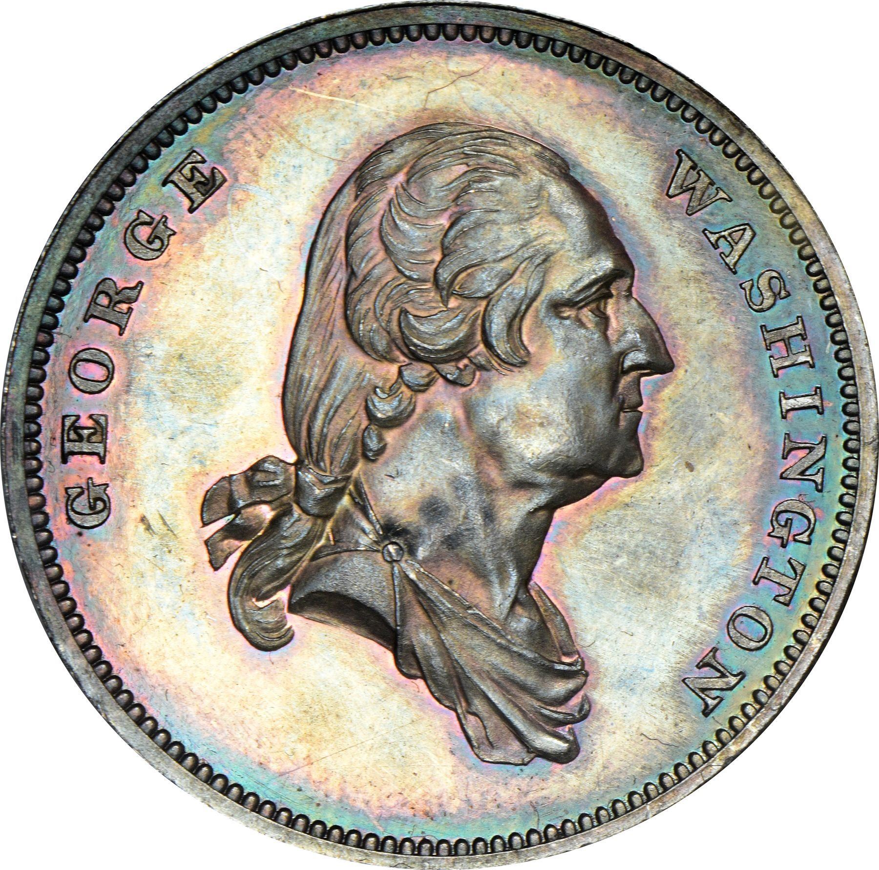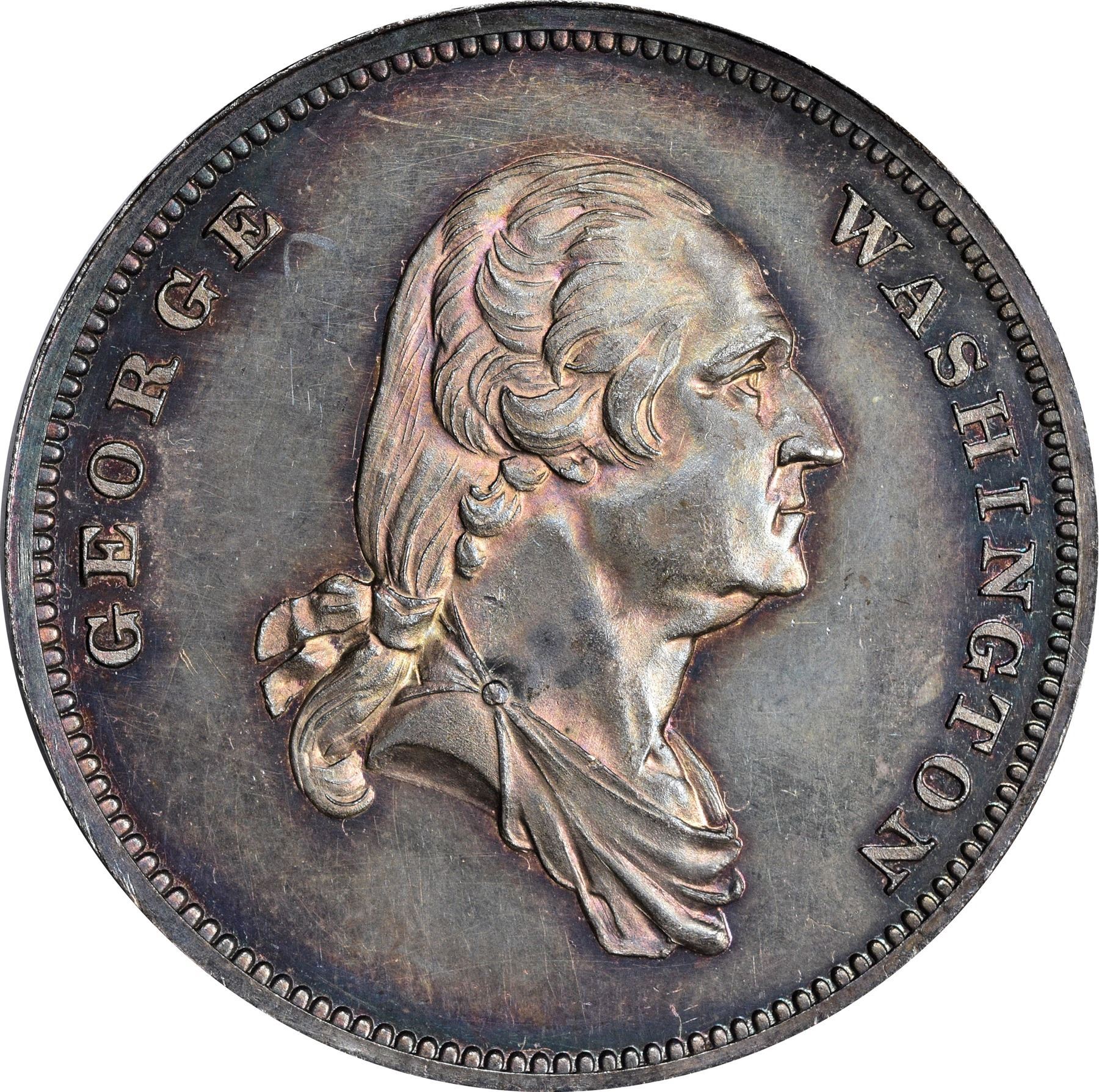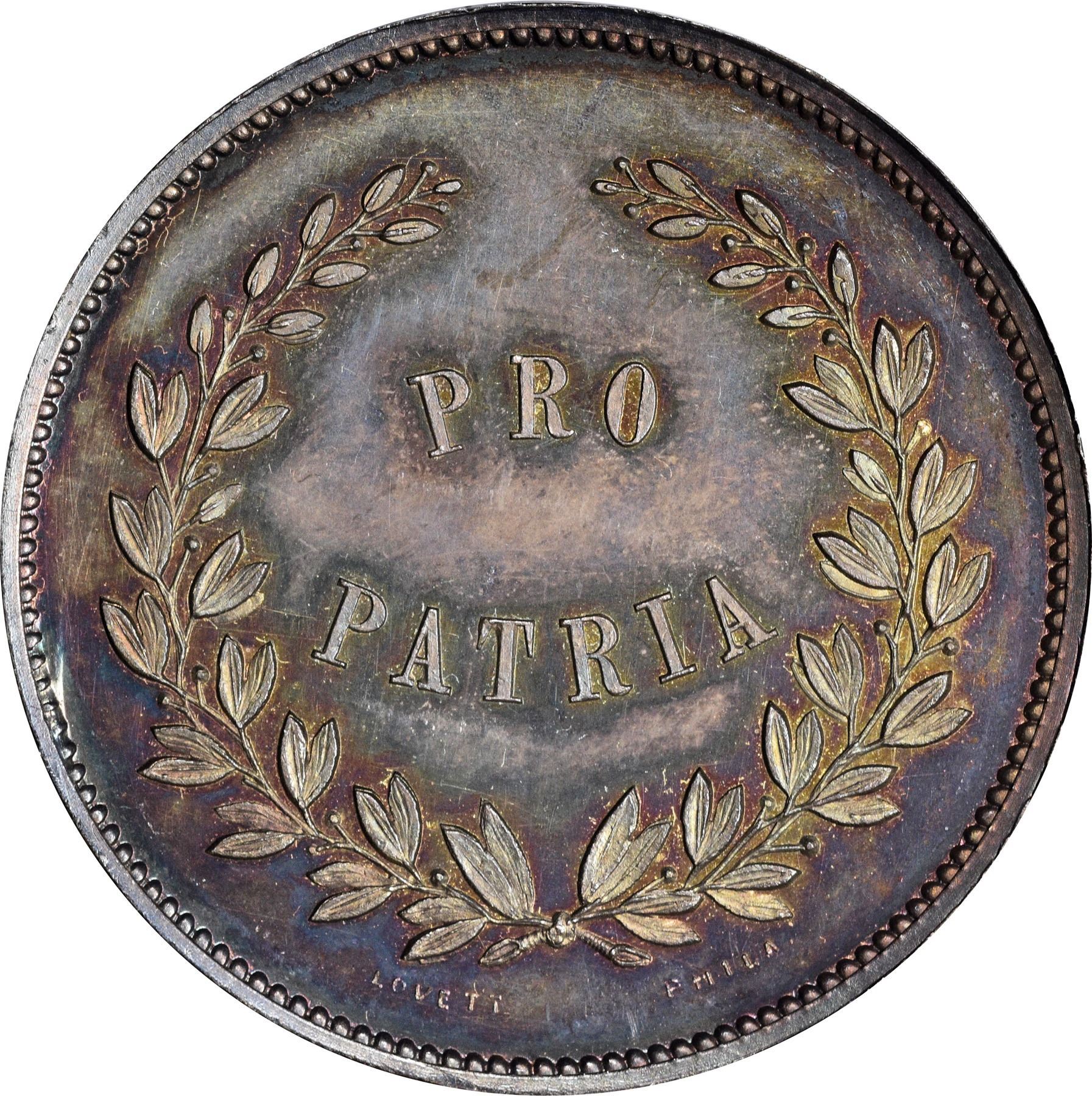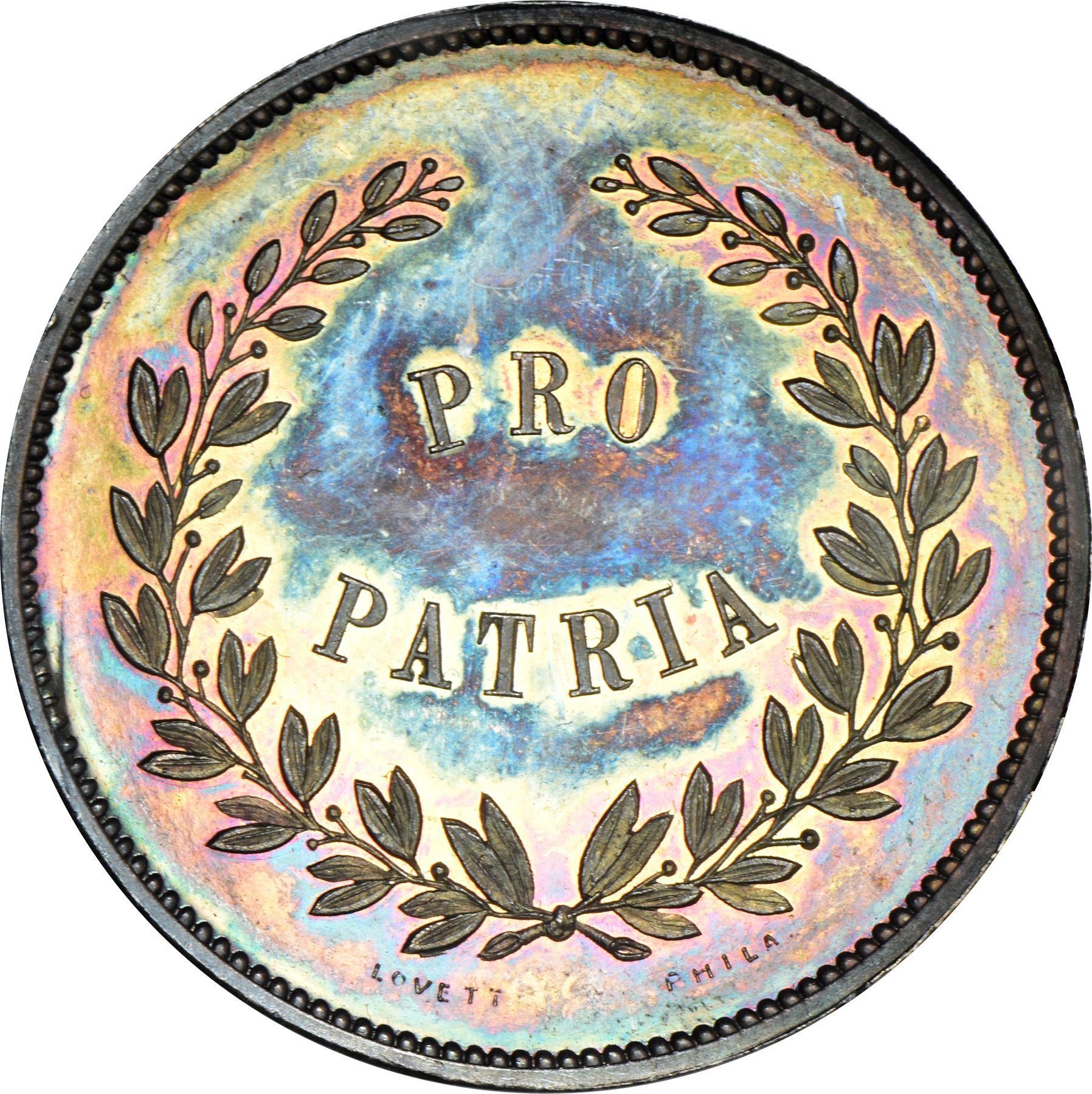 Description: bordering on choice. Dies as illustrated, by Robert Lovett, Jr. at the behest of coin dealer Edward Cogan. 31 mm. This satiny steel-gray specimen is virtually alive with festive peach, rose, gold, and neon-blue iridescence evenly and attractively displayed on both sides.