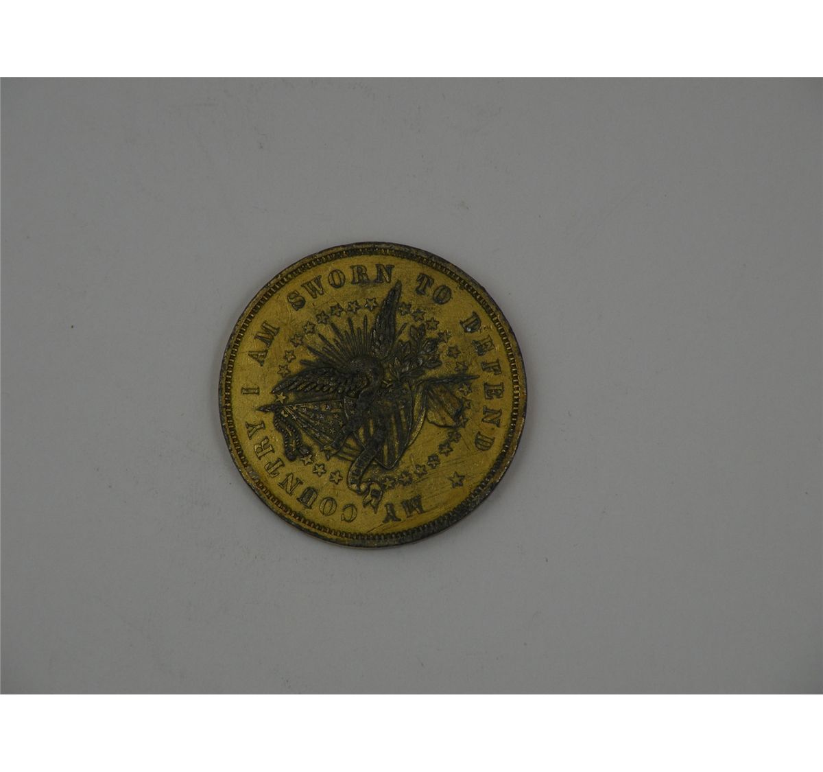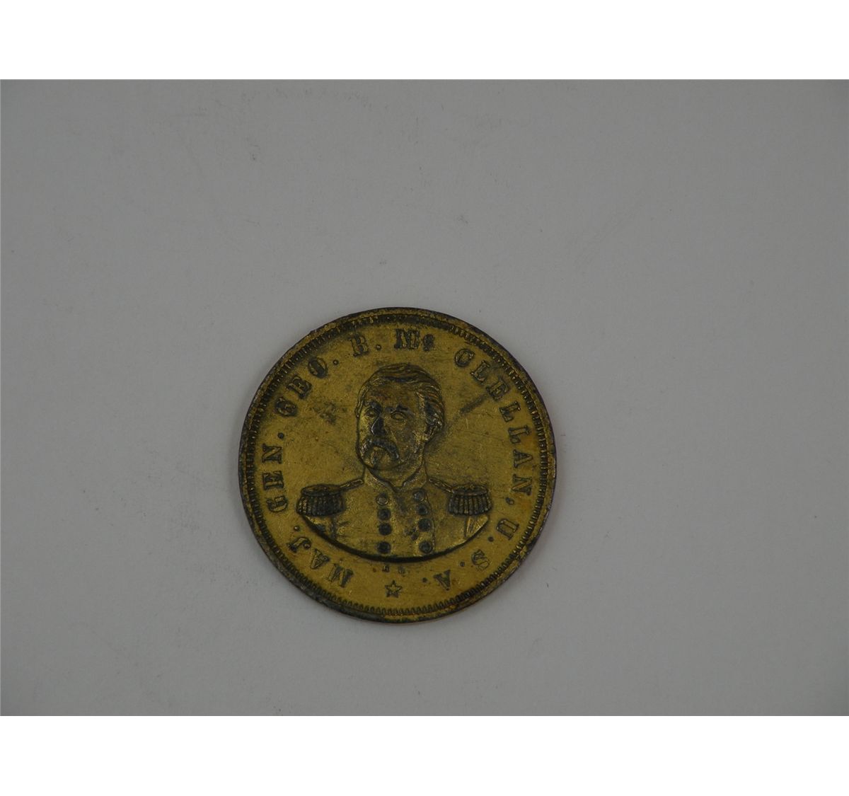 Circa 1864 Major General George B. McClellan political medal. 34mm, Gilt white metal. Portrait of McClellan/ Eagle, Shield and Flag. The reverse legend reads "MY COUNTRY I AM SWORN TO DEFEND". Abt. Ext. Fine. Est. $85