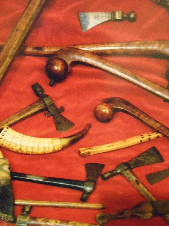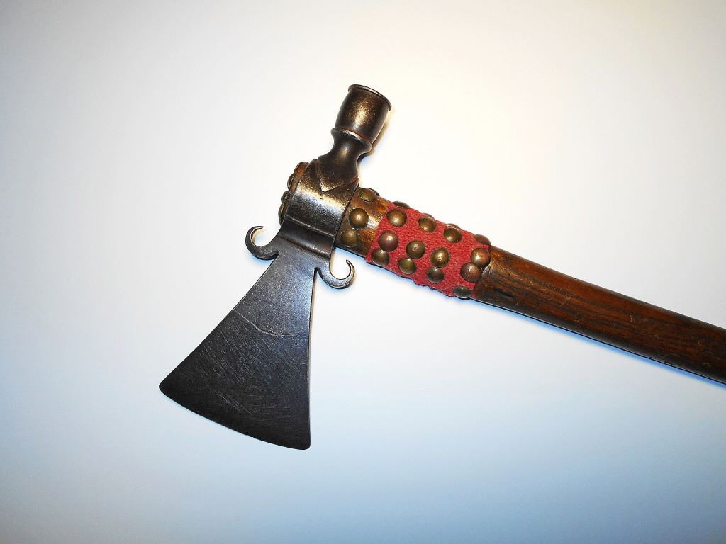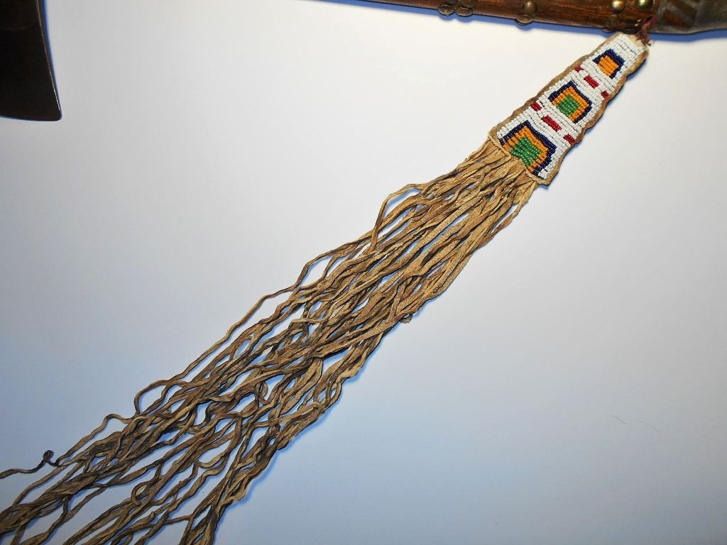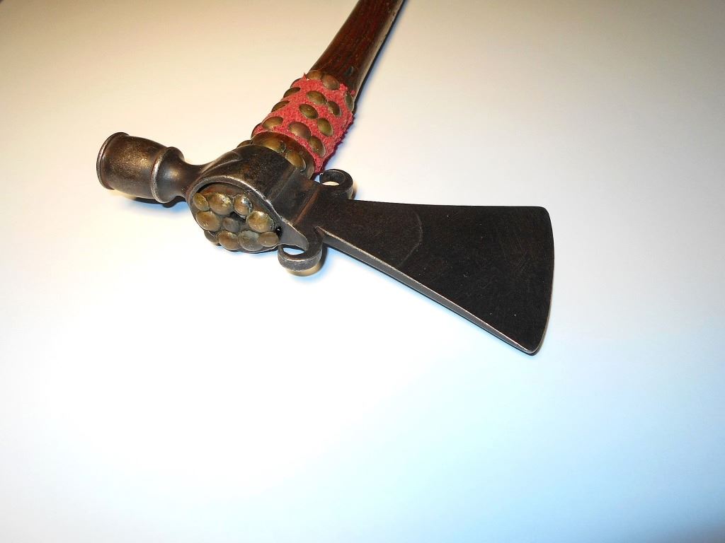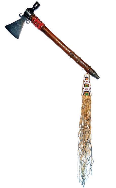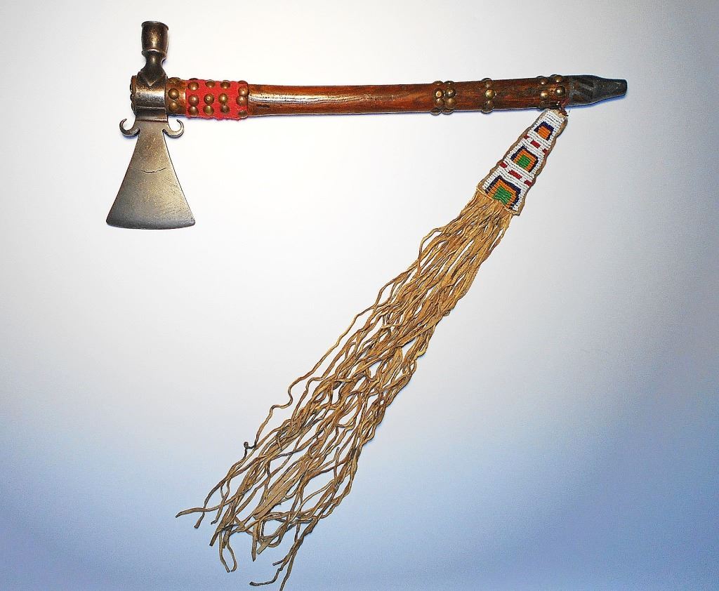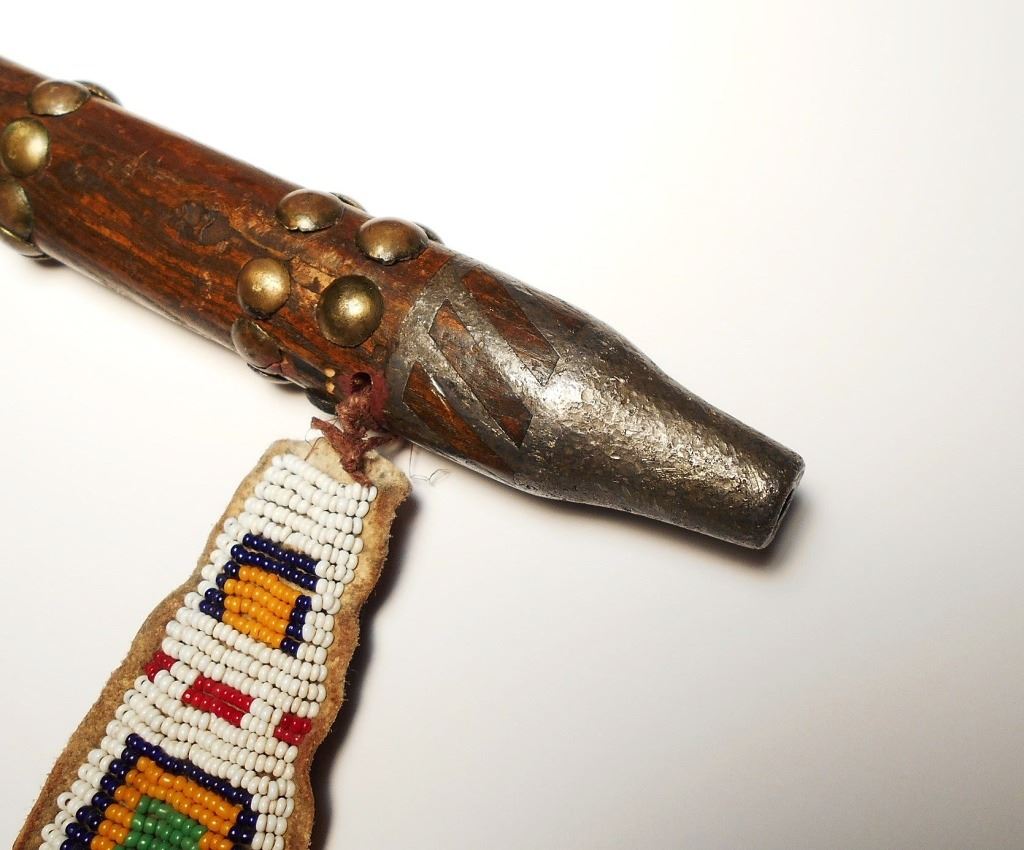 This is an outstanding and rare Indian Wars era circa 1870 pipe Tomahawk with beaded drop and pewter inlaid smoking tip from the Cheyenne Native American Indians. The piece features a forged iron head in a very scarce pattern of “double-curled basal processes” on each side of the blade. Only a few documented examples of this pattern of head are known with one being photographed on page 2 of John Baldwin’s book “Tomahawks & Pipe Axes of the American Frontier” a picture of this page and tomahawk are shown for example. The head was blacksmith forged from an old rifle barrel and the blade forging fold can be seen on the front left side. The piece has a vase shaped bowl with double ridge flowing into the forge molded chevrons with a tear drop shaped eyelet hole. The head is secured to the solid wood haft with an old hide gasket and various early trade brass trade tacks. The hardwood haft handle is adorned with a wrap of old red stroud trade clothe and brass trade tacks at the top with the haft having a slight curved taper. The gripping area of the handle shows five bands or rows of old brass trade tacks. Pierced hole which holds the beaded drop and finishes in an presentation quality inlaid poured pewter smoking tip. The pewter smoking tip shows a diagonal twisted pattern with tapering smoking tip. The beaded drop is comprised of Indian tanned buckskin hide with period correct glass trade seed beads in a typical Cheyenne geometric block design in colors of chalk white, greasy butterscotch yellow, cobalt, medium green, and red. Provenance: From the ex-collection of noted tomahawk expert and collector Ben Thompson and later sold to fellow collector Tom Hardy in the 2000’s. The entire piece has an outstanding original mellow patina and displays very well with a few nicks, dings and scratches expected from its authentic original age and native use. Measures overall 17.5”L with a head that is 7”L by 3”W and an additional 20”L drop.