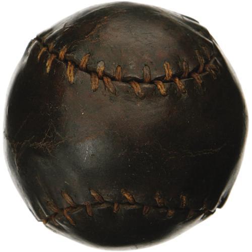 <B>Circa 1870 "Figure Eight" Model Baseball.</B></I> Spectacular ancient baseball artifact represents the earliest and finest example we've seen of this first evolutionary step away from the "lemon peel" style that dominated the game of baseball until this point. The ball is skillfully constructed, perfectly spherical and well-balanced, and wonderfully preserved with every last stitch solidly in place. The importance of this piece is difficult to overstate--after all, such innovations as the curve ball and split-fingered fastball would never have become part of the game's lexicon. The ball measures approximately seven inches in circumference (modern balls are nine inches around), a size that likewise dominated the game at the time. A very special piece, as any serious baseball historian will realize.<BR><BR><b>Shipping:</b> Balls, Pucks, etc., Small (<a target="_blank" href="http://www.heritageauctions.com/common/shipping.php">view shipping information</a>)