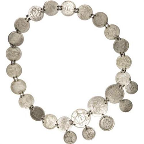 <B>Fantastic Circa 1878 Love Token Necklace.</B></I> This outstanding necklace consists of 19 dimes, four half dimes, two twenty cent pieces, and one quarter. Two of the dimes were expertly engraved, one with a horse and one with a dog, just incredible! Pieces like this lot are seldom seen today, as most have been broken up for singles.<BR><BR><b>Shipping:</b> Coins & Currency (<a target="_blank" href="http://www.heritageauctions.com/common/shipping.php">view shipping information</a>)