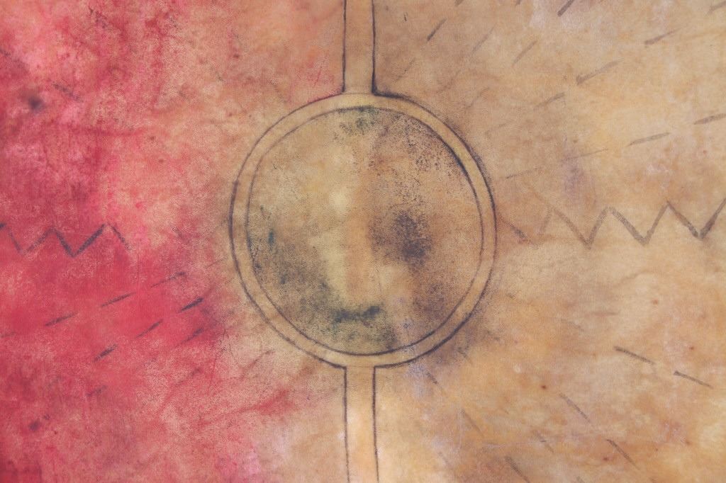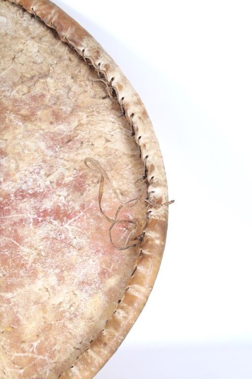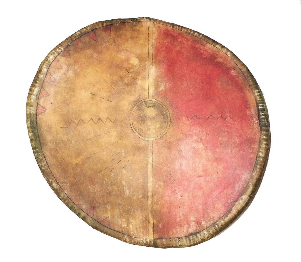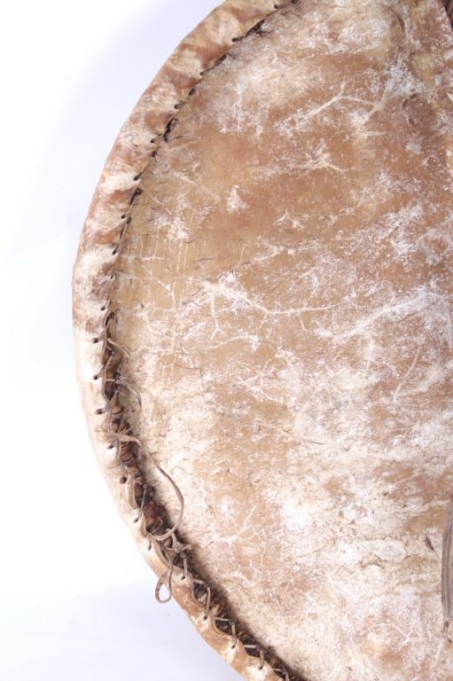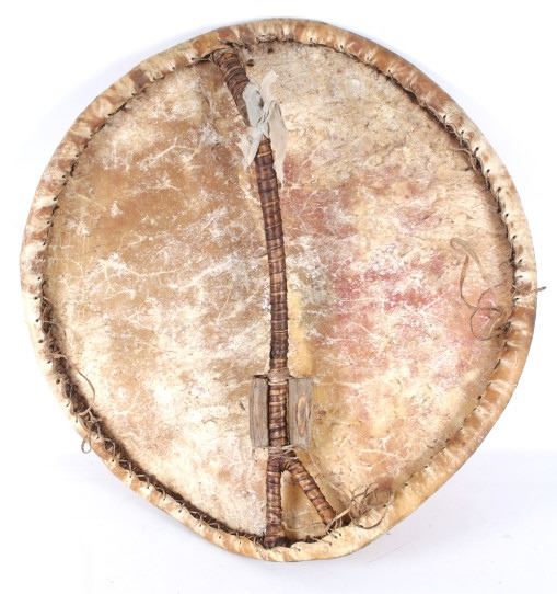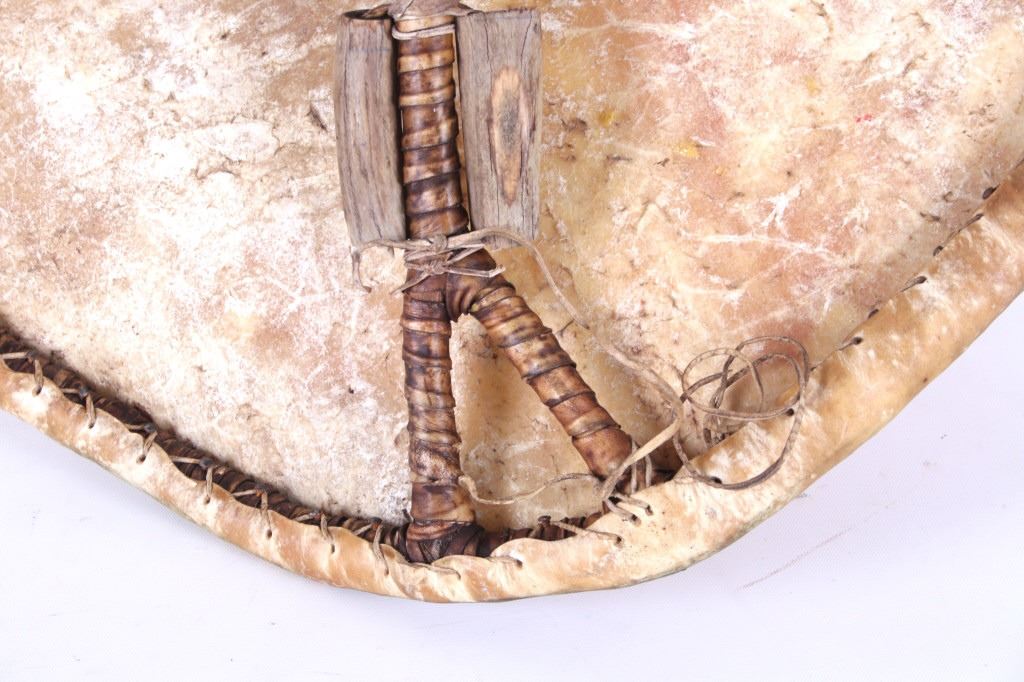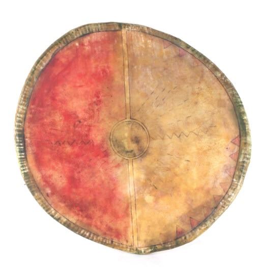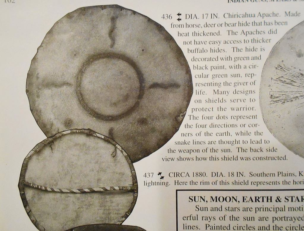 This is an outstanding circa 1880 Apache War Shield collected from the Chiricahua Apache in Southeast Arizona. The large example is comprised of parfleche black bear hide wetted and stretched over a bent wood hoop frame. Some consider the Apache to not have access to Buffalo hide and subsequently used Black Bear, Elk, Deer, Horse and Cow hides such as this amazing example. The original hard wood carrying band is still intact on the reverse side and is made of hard wood wrapped with hide tightly. The Apache have been documented as not making shoulder straps or arm bands on the back side of their shields, but rather used a thick hardwood carrying band wrapped in hide; other examples documenting this are shown in the photo gallery for comparison. The shield has a slight warp from drying and true age. This is a larger, heavier war shield and not a dance or ceremonial shield. The front of the shield has old pigment mineral polychrome paint with old symbols that have faded with time, of what appears to be a sunburst and lightning bolts, painted in red, black, and green with traces of yellow ochre / ocher still on the shield. Apache shields, especially from the Chiricahua, are quite rare in the collecting community in comparison to Plains shields and other tribes. The shield is overall in good condition with stiff parfleche hide, much of the paint remnants still beautifully visible, some wear to the hide but no major cuts, the sinew hide lacing is still intact on the back and some old trade clothe still tied to the gripping section. One of the better more scarcely seen Apache example we have offered for sale. Other published examples of similar Apache shields with hard wood straps are shown in the photo gallery for comparison from authors and scholars such as John Baldwin. Provenance: From the ex-collection of Bob Allerton Dallas, Texas. Measures overall 26 inches across.