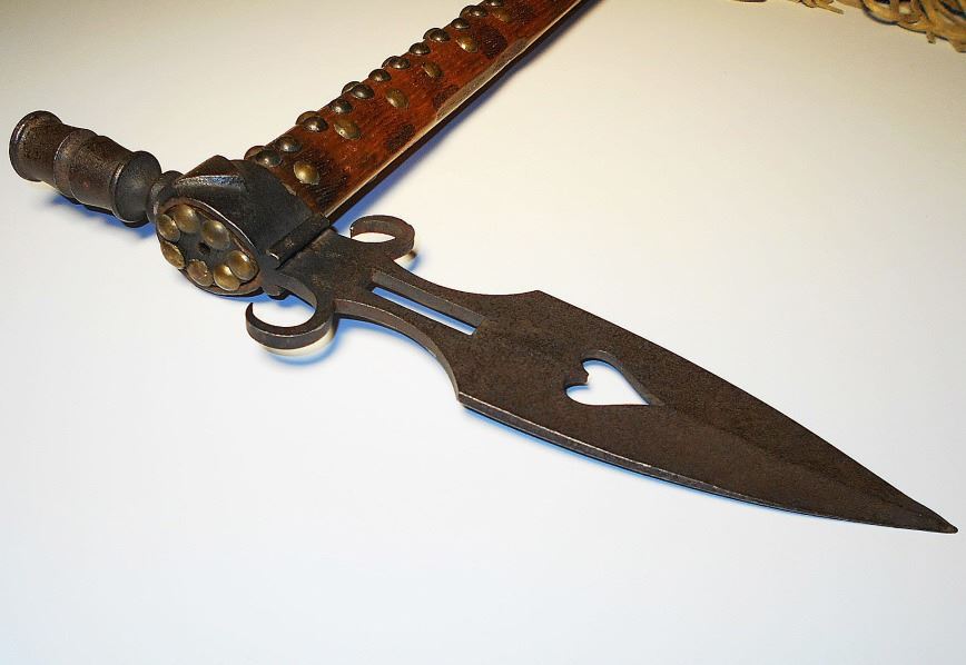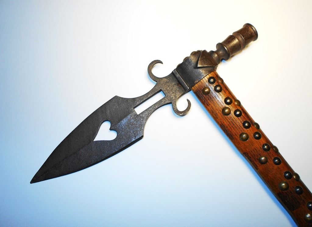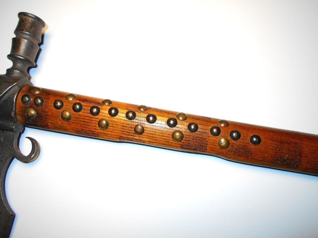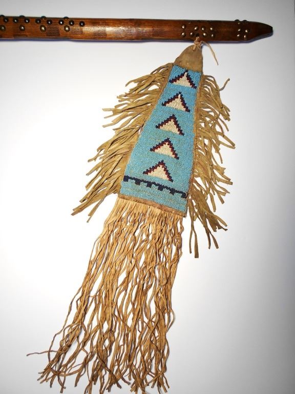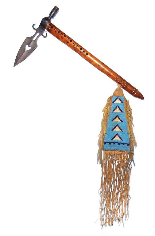 The lot features a wonderful authentic circa 1880 Sioux Native American Indian spontoon pipe tomahawk with beautiful, beaded Buffalo hide drop. This is a well-documented pattern of tomahawk known amongst the Sioux in the Dakotas during the 19th Century showing a prominent spontoon head with upward basal curled processes and blade cut outs. The forged axe features a spontoon double edge head with medial ridge running down both sides of the blade with a weeping heart cutout at the center. Above the blade the head tapers into an hourglass like neck with long rectangular cutout at the center ending in the upward turned basal processes. The eyelet hole shows prominent rounded forged moldings with a tall thin vase like pipe bowl which has chevron moldings and additional ridge moldings. The head is secured onto the haft with a leather gasket at the tear drop eyelet hole along with various old brass trade tacks and the clean out plug hole is visible with the plug long missing. The pipe bowl is tall with artful file work in a vase pattern, an early tomahawk attribute amongst authentic early examples such as this. The raised median running down the center of the blade on both sides is also a well-documented early authentic weapons feature on period-correct tomahawk examples such as this according to experts Baldwin, Francis, Peterson, etc… The wood haft is comprised of hardwood with old faded hot file brandings and old brass trade tack patterns with an incised gripping area and pierced hold holding the beaded drop. The beaded drop is constructed of Indian tanned Buffalo Bison hide with old blue stroud clothe backing, frilly buckskin Indian hide fringe and period correct glass trade seed geometric beadwork. The beadwork shows a light sky padre blue background with pattern in chalk white, cobalt and red. The drop is tied onto the tomahawk with old hide lacing. Provenance: Original collected by artifact dealer Jim Aplan of Piedmont, South Dakota directly off the Pine Ridge Indian Reservation and later sold to collector Tom Hardy of Indianapolis, Indiana in the late 1990’s. The entire tomahawk has a nice mellow patina and is truly an attractive, artful example in well preserved condition. Measures overall 22”L with an additional 24.5”L beaded drop and head that is 12.25”L.