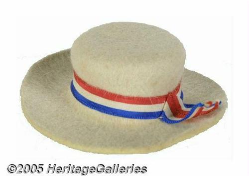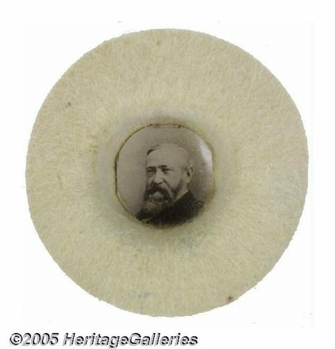 <B>Circa 1888 Benjamin Harrison Miniature Felt Campaign Hat</B></I> This clever novelty is a miniature white felt hat with red, white and blue grosgrain ribbon hat band. Inside the crown is an approximately one inch albumen photograph of Benjamin Harrison. During the elections of 1888 and 1892, Republican supporters urged voters to reinstall another Harrison in the White House. Harrison's grandfather was William Henry Harrison, who wore a hat of this type. Slogans, such as "Grandfather's hat fits Ben..." or "The Same Old Hat," were seen on a variety of campaign items. This cute artifact measures 2 1/2" across x 1" high and rather resembles a planter's hat. While the full-sized top hats with Cleveland and Harrison portraits inside are quite familiar, this version is less so. Probably intended for suspension from some sort of hanger for wearing. The top side of the hat would normally be displayed, and someone could flip the hat over to see the candidate being supported by the wearer, making this item part of the genre of "mechanical" political badges which were quite popular in this era. Choice, virtually mint condition. Lot:260