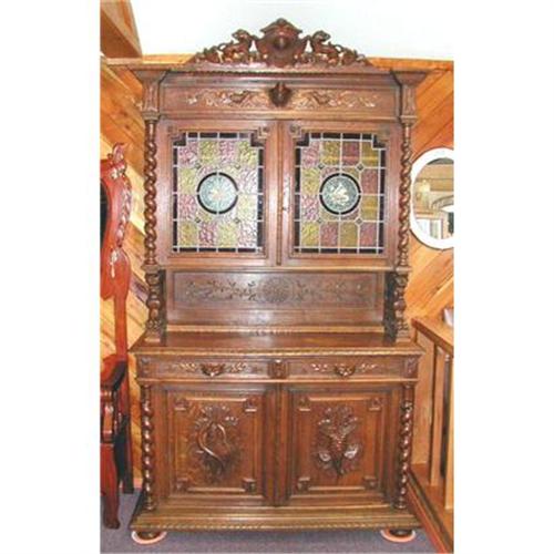We are offering for sale this Exceptionally Grand C.1890 French Buffet Cabinet. The piece has nice Barley Twist accents around the top and bottom front edges. Beautiful multi-colored stained glass doors. There are 2 winged Griffins holding up the top cabinet. This piece is nicely carved with Lions heads on the two front drawers and the bottom cabinet also being carved with the images of a bird on one side and fish on the other. There are 3 shelves, all adjustable, two on top and one on the bottom. The piece comes with a key and all cabinet doors do lock. Nice Crest on the top showing two lions holding up a Shield. On the back of the Crest is stamped into the wood "E. Dutheil" which is the name of the maker. This piece is very clean but does show it's age. There are a few problems such as the Stained Glass has 5 cracked panes which have been glued and are stable, not a big issue and easily repairable if desired. There are also several small cracks/splitting in the wood do to age, one is along the top surface and can be seen from one of the photographs, two other small cracks on the Griffins nothing major just normal ageing. Grand piece of furniture for any home.For additional photo's or information on this piece please contact us by clicking on the "EMAIL DEALER" button, we'll be happy to supply you with any information on this piece that is requested including a shipping quote if needed. Thank you for looking.