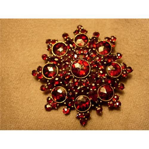 Attractive stylized star garnet Victorian brooch set with numerous full cut and rose cut garnets into a stylized three-dimensional star pattern - nice large stones set into low grade "garnet gold" (typical setting for Victorian garnet jewelry) replacement safety catch tube hinge. Pretty design.