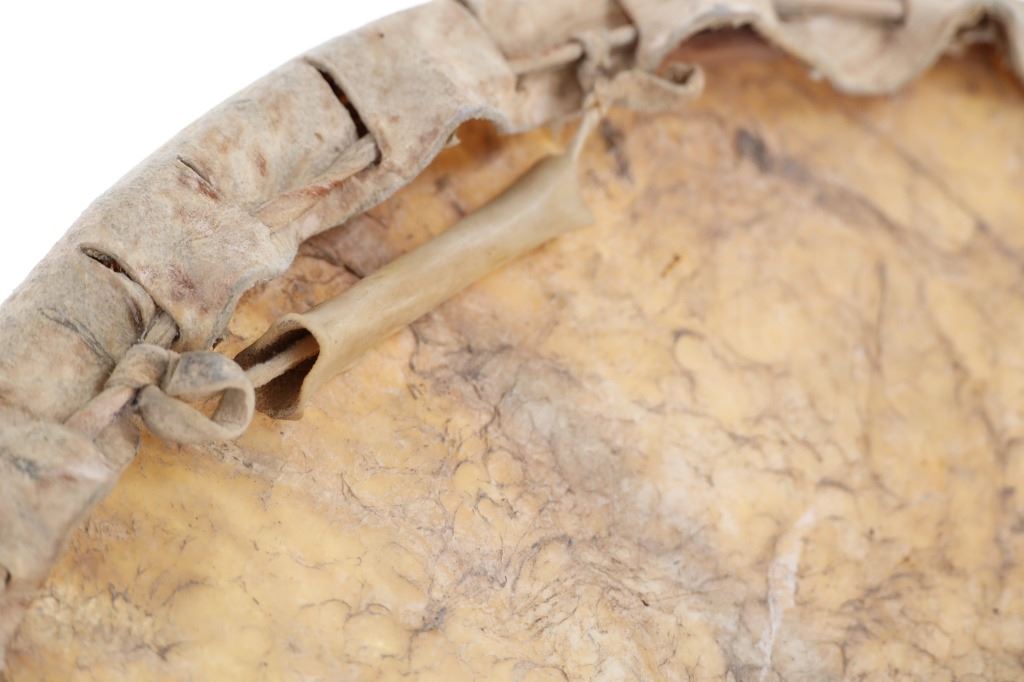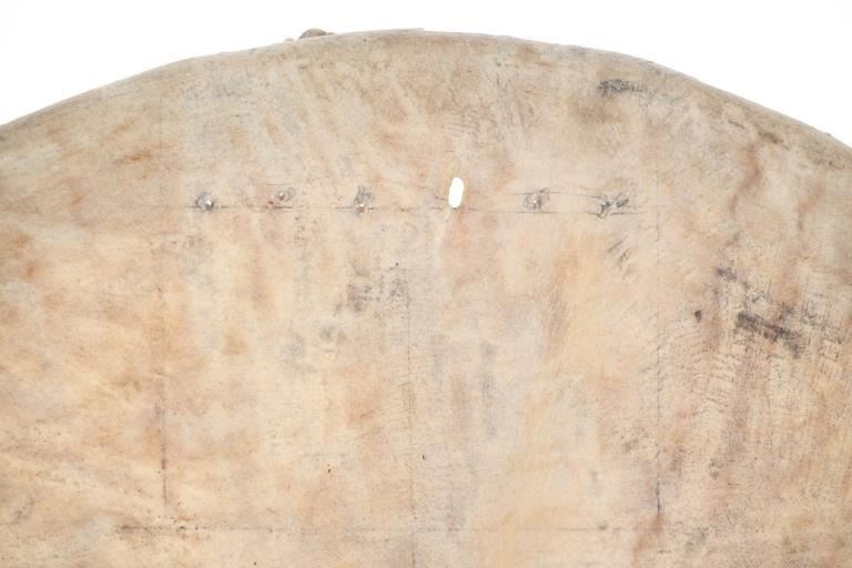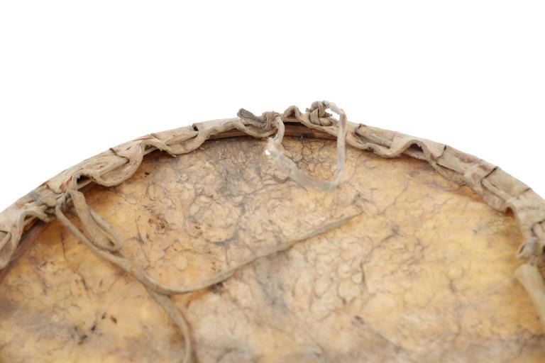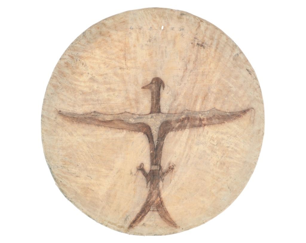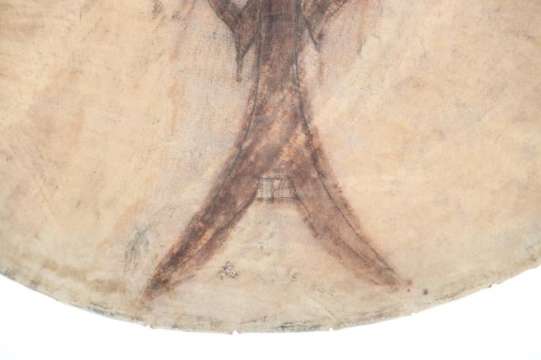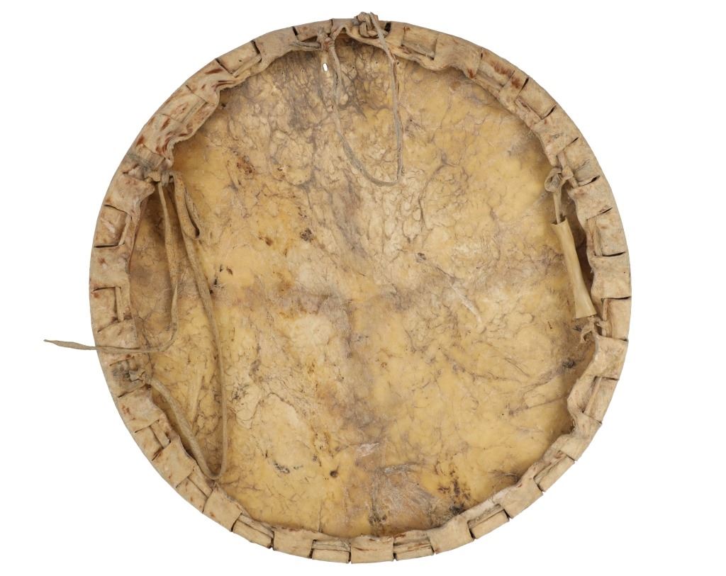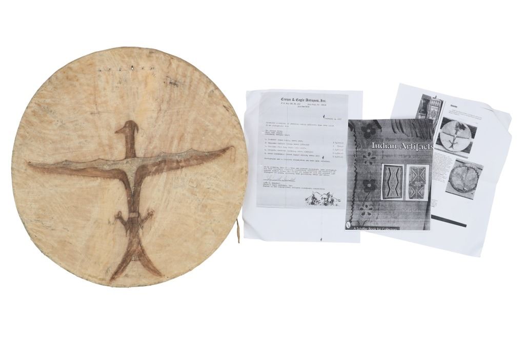 This is a fine, authentic 19th-century Sioux Ghost Dance Shield from the ex-Joseph Moore collection Savannah, Georgia, a private collection from Paris, France and accompanied with a 1987 provenance document. The circa 1890’s Ghost Dance shield exhibits a stripped / carved wood branch bent wood hoop frame with stretched rawhide parfleche held into place with rawhide lacing and shows Indian hide ties attached. The front shows the parfleche rawhide of buffalo / bison hide with a painted large black waterbird flying up towards the sky with wings spread at the center. The top shows six holes which would have held a drop of feathers or something similar. There is a unique bone handle strung on Indian hide along the back, a very unique and unusual original attribution. The shield shows nice wear and patina. Provenance: From the ex-collection of Joseph Moore Savannah, George; private collection of fine Native American antiques from Paris, France, accompanied by a February 3, 1987 Crown & Eagle Antiques, Inc New Hope, PA Insurance Appraisal and Identification signed copy of a document from Lynn D. Trusdell (member of the Pennsylvania Antique Appraisers Association) for Mr. Joseph Moore noting the shield as, “5. Sioux Ceremonial (Ghsot Dance) Shield, circa 1910 $2,500.00 (the equivalent to around $7,000-$8,000 in today's money). Similar to the example published in “The Four Winds Guide to Indian Artifacts” by Preston E. Miller & Carolyn Corey on page 128 noting it as a “Sioux Rawhide Shield c. 1903 collected at Pine Ridge Res. By Mary Secrest by No Two Horns Sold $3500 See Wooley and Horse Capture, “Joseph No Two Horns” American Indian Art, Magazine, Scottsdale, Summer 1993: 32-43; Sotheby’s example sold in 1992 and at Dunnings, Winter 1995: lots 2184 and 2185; also see the shield sold by North American Auction Co. 1890 Ghost Dance Plains Shield ex-Forest Fenn sold in March 2024 for around $4,700 (shown w/ bp). Copy of the appraisal and book cover and page included with lot. The shield is well kept, displays well with no major damages. Measures overall 17.25-inches in diameter.