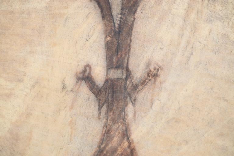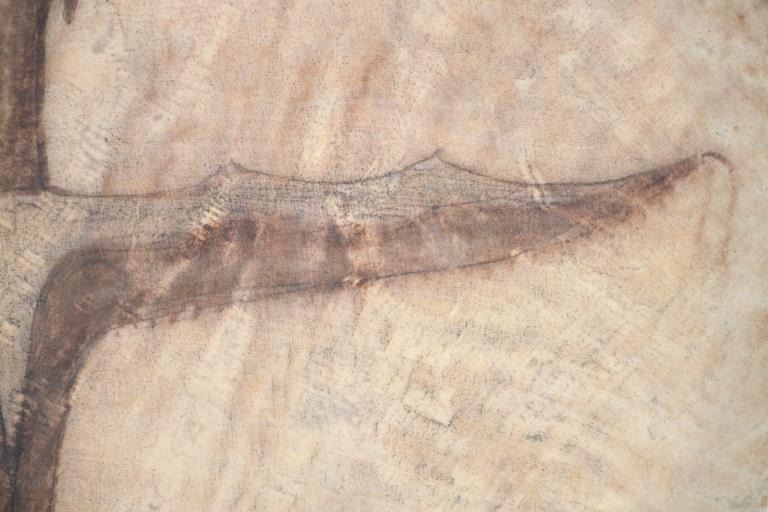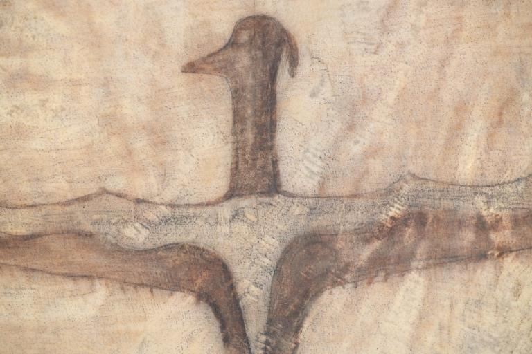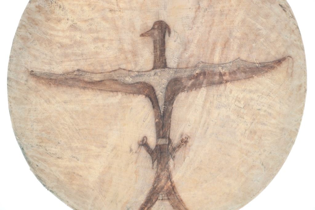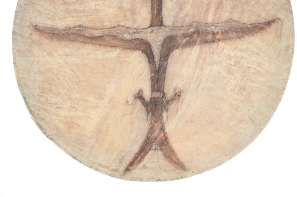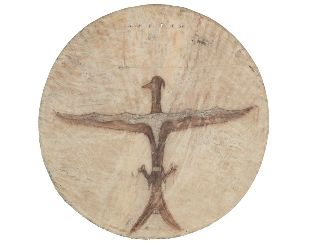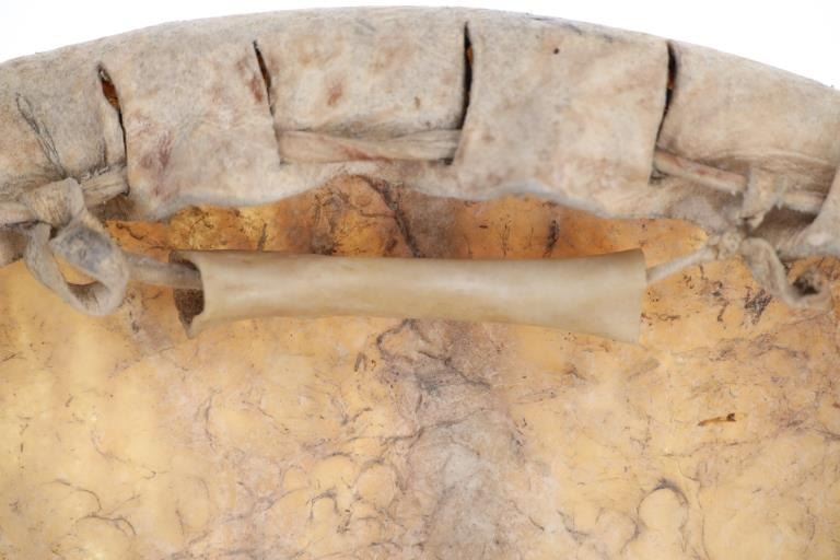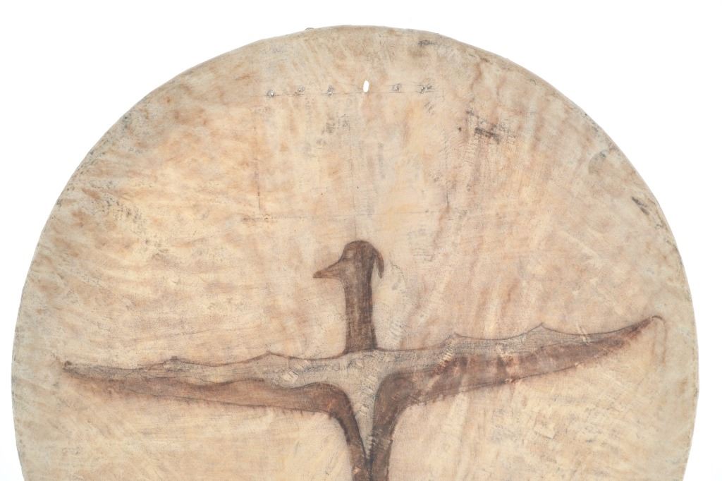 This is a fine, authentic 19th-century Sioux Ghost Dance Shield from the ex-Joseph Moore collection Savannah, Georgia, a private collection from Paris, France and accompanied with a 1987 provenance document. The circa 1890’s Ghost Dance shield exhibits a stripped / carved wood branch bent wood hoop frame with stretched rawhide parfleche held into place with rawhide lacing and shows Indian hide ties attached. The front shows the parfleche rawhide of buffalo / bison hide with a painted large black waterbird flying up towards the sky with wings spread at the center. The top shows six holes which would have held a drop of feathers or something similar. There is a unique bone handle strung on Indian hide along the back, a very unique and unusual original attribution. The shield shows nice wear and patina. Provenance: From the ex-collection of Joseph Moore Savannah, George; private collection of fine Native American antiques from Paris, France, accompanied by a February 3, 1987 Crown & Eagle Antiques, Inc New Hope, PA Insurance Appraisal and Identification signed copy of a document from Lynn D. Trusdell (member of the Pennsylvania Antique Appraisers Association) for Mr. Joseph Moore noting the shield as, “5. Sioux Ceremonial (Ghsot Dance) Shield, circa 1910 $2,500.00 (the equivalent to around $7,000-$8,000 in today's money). Similar to the example published in “The Four Winds Guide to Indian Artifacts” by Preston E. Miller & Carolyn Corey on page 128 noting it as a “Sioux Rawhide Shield c. 1903 collected at Pine Ridge Res. By Mary Secrest by No Two Horns Sold $3500 See Wooley and Horse Capture, “Joseph No Two Horns” American Indian Art, Magazine, Scottsdale, Summer 1993: 32-43; Sotheby’s example sold in 1992 and at Dunnings, Winter 1995: lots 2184 and 2185; also see the shield sold by North American Auction Co. 1890 Ghost Dance Plains Shield ex-Forest Fenn sold in March 2024 for around $4,700 (shown w/ bp). Copy of the appraisal and book cover and page included with lot. The shield is well kept, displays well with no major damages. Measures overall 17.25-inches in diameter.