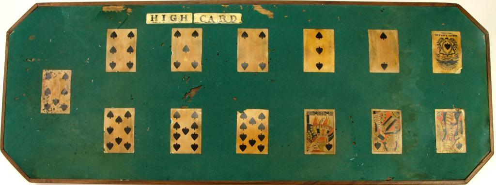 unmarked, 15" X 39" with all 13 cards intact, green felt shows scattered loss and moth damage, card deck by Samuel Hart & Co. A hard to find saloon item.