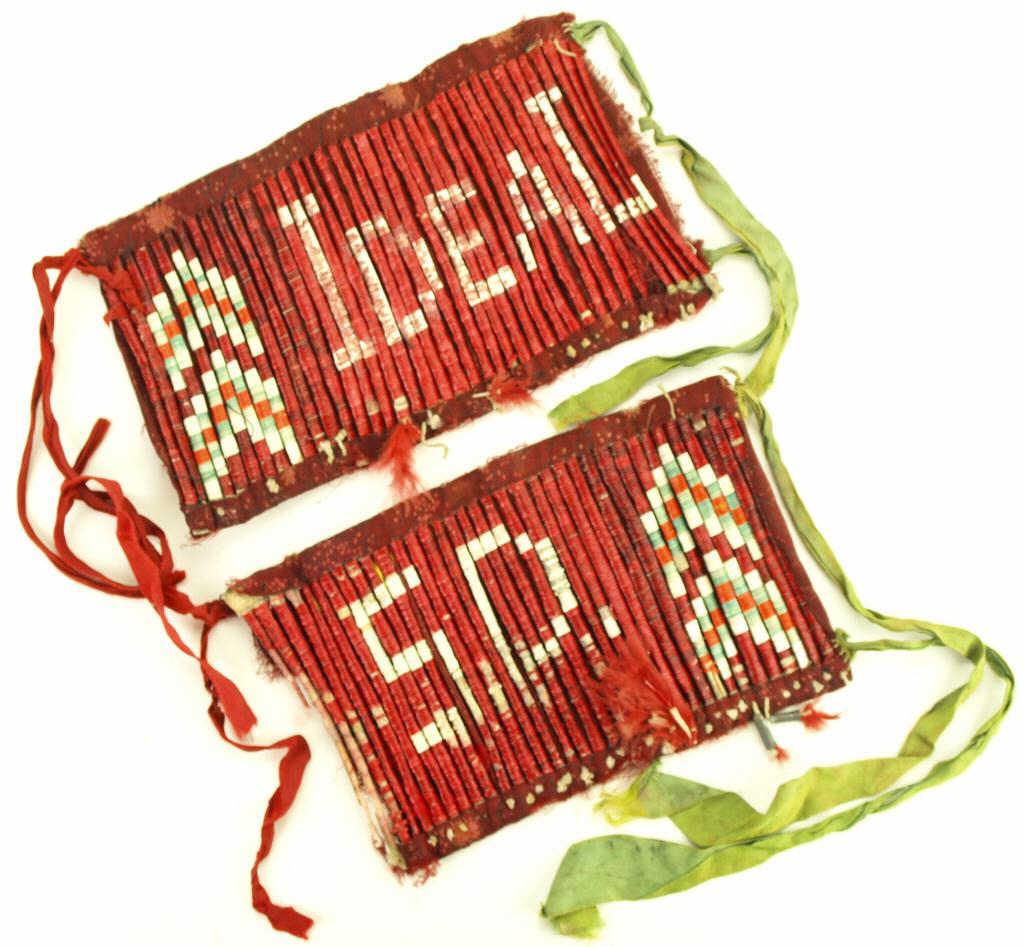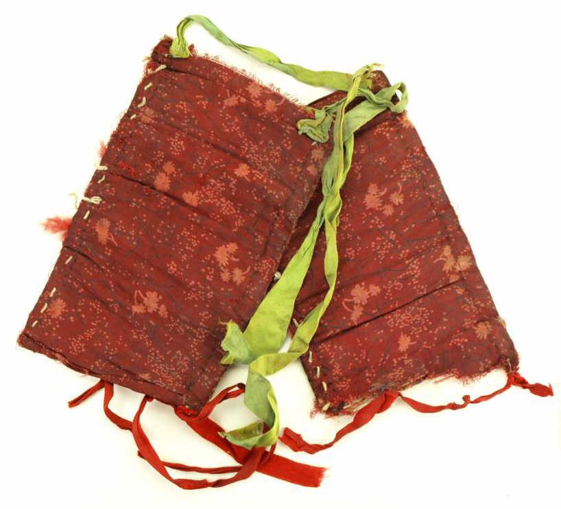 marked Ideal SD showing some loss of quill, cotton calico lining and ribbon ties with feather and tin cone drops. Each measure 4 1/2" X 8".