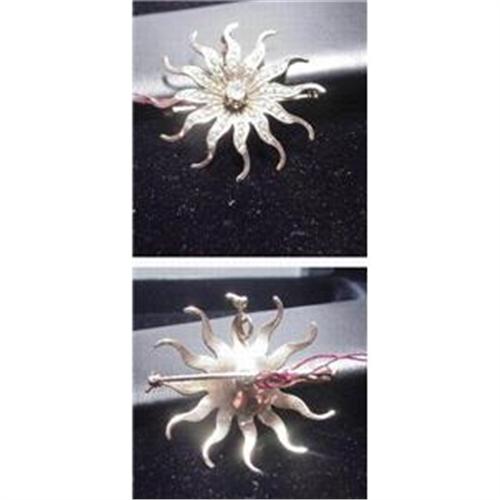 Charming Victorian 10kt yellow gold, pearl and diamond sunburst brooch/pendant set with numerous small pearls and one (1) approx .25 ct Old European Cut Diamond with original pin stem assembly and retractable bail for pendant. Sweet lovely piece in Great Condition. Please call or email for more info. We accept visa/mc, by phone