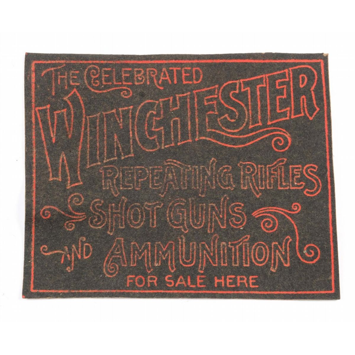 This piece measures 11x13 and is made of heavy brown/black felt . The printing is in orange. It remains in excellent condition with no moth holes or tears of any kind and the majority of the orange printing is vibrant. These are referred to as counter mats and would be used at gun shops of the era to lay guns on the counter for inspection. Size 13"