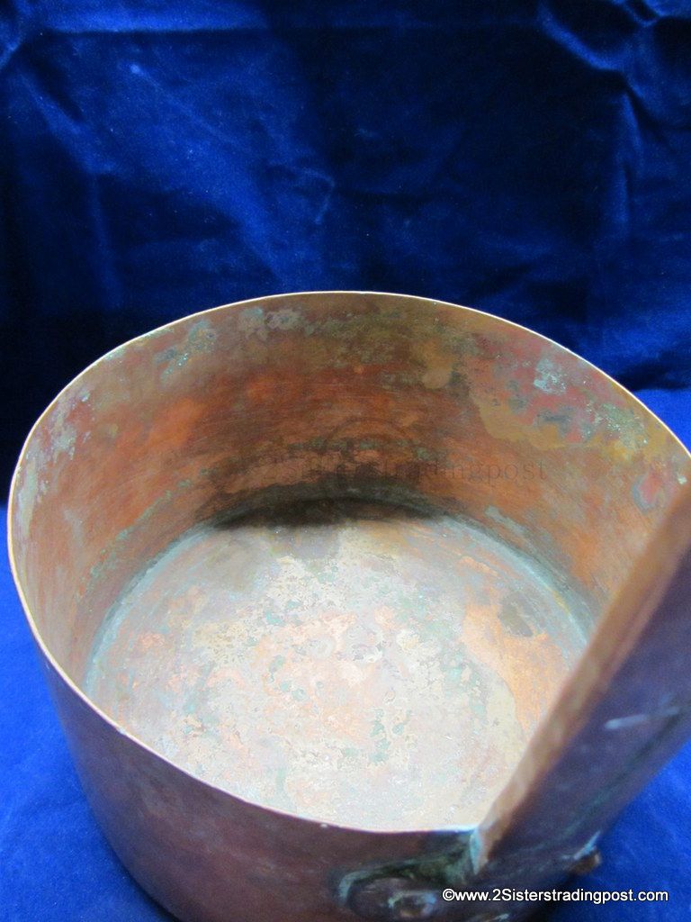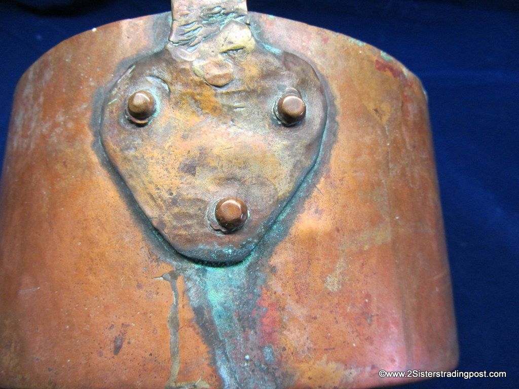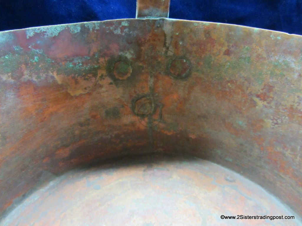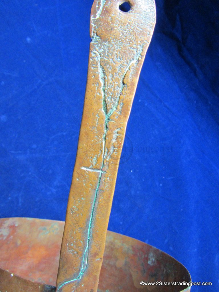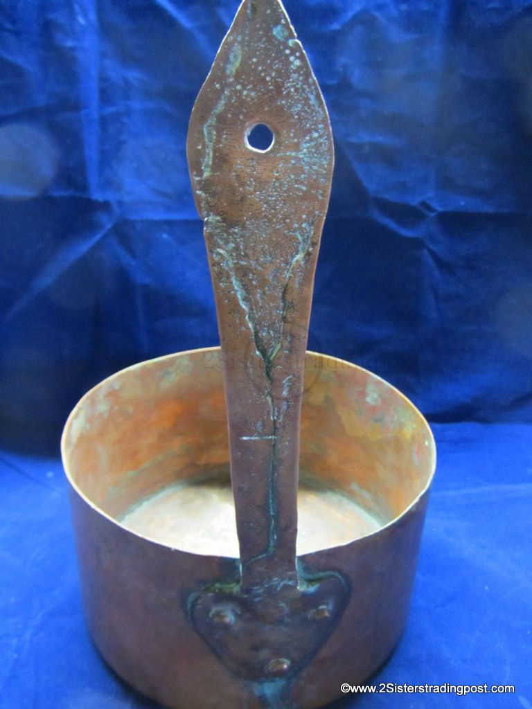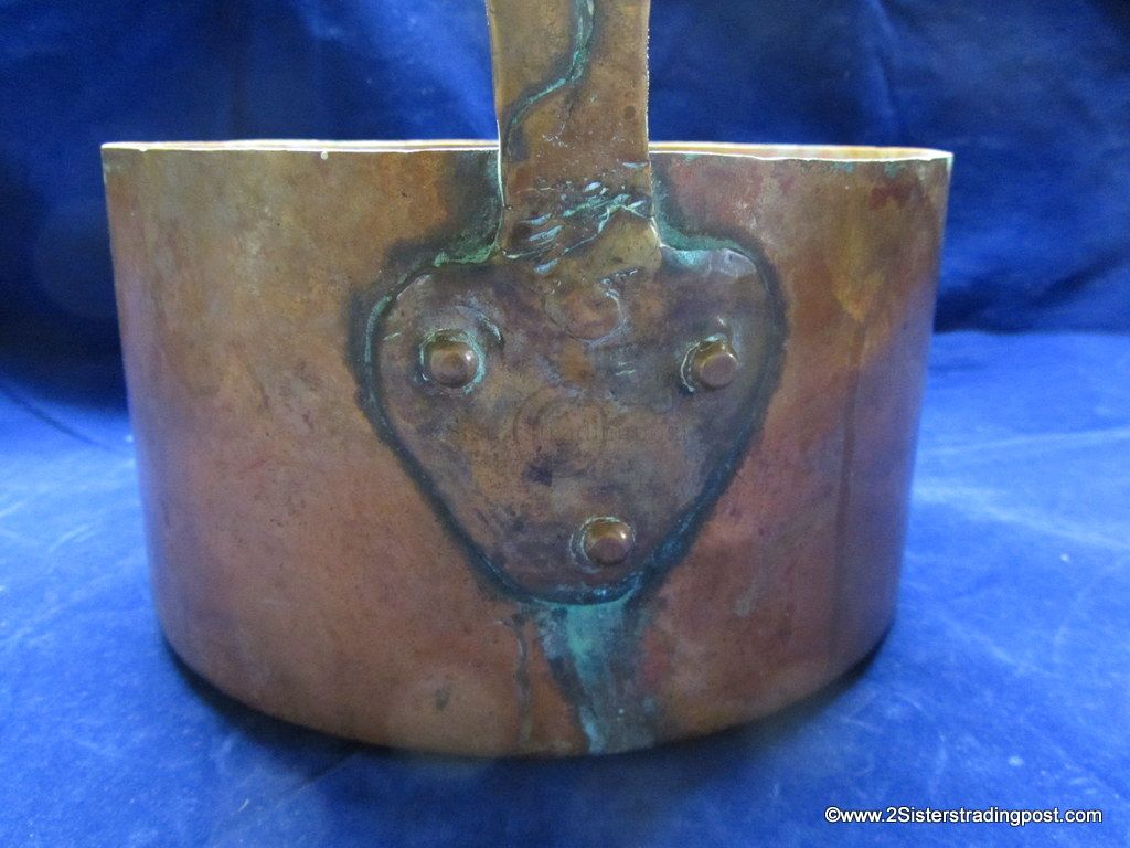 This Copper pot was hand hammered, has a rolled handle with a heart shaped joining plate where it attached to the pot.