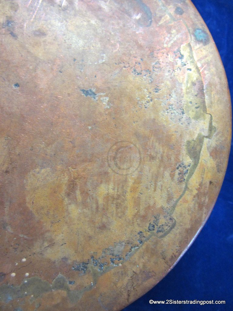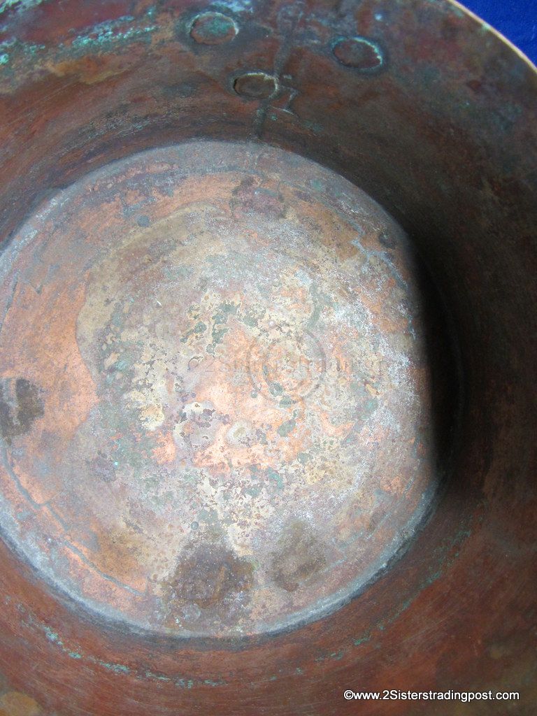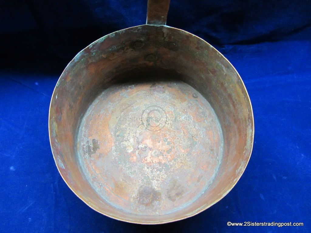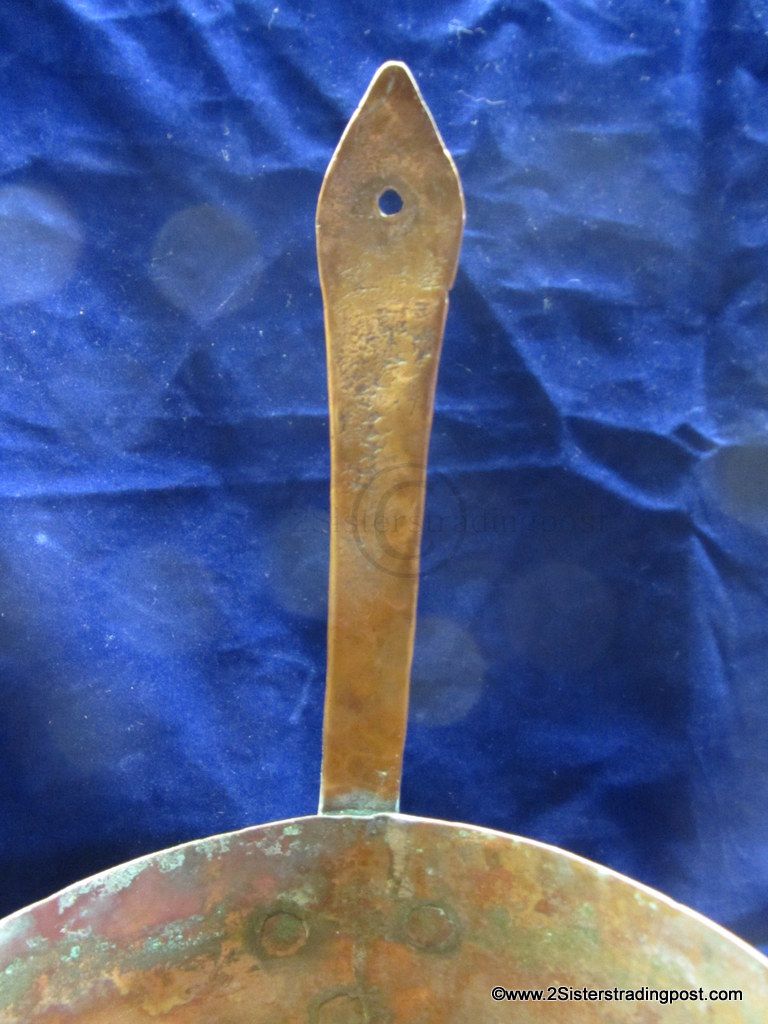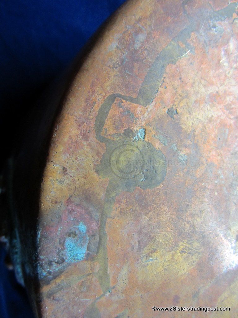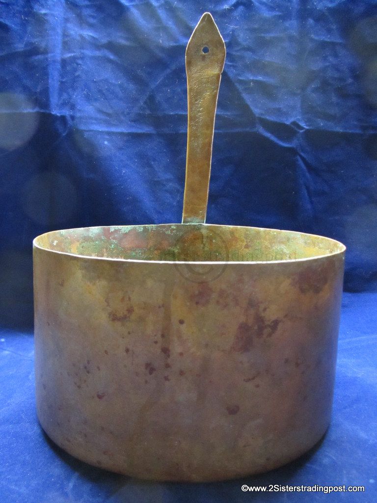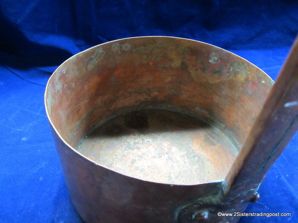 This Copper pot was hand hammered, has a rolled handle with a heart shaped joining plate where it attached to the pot.