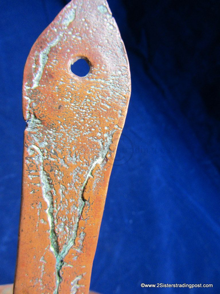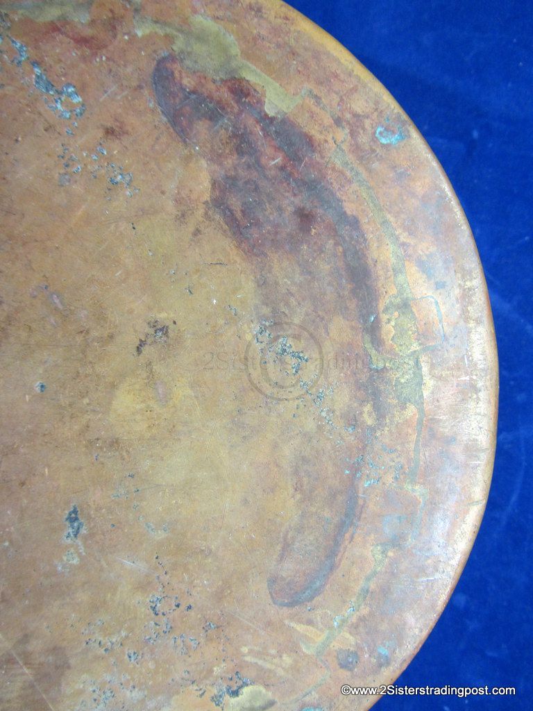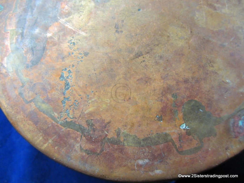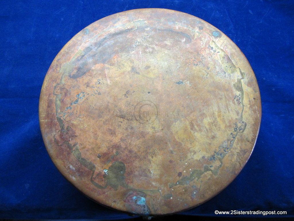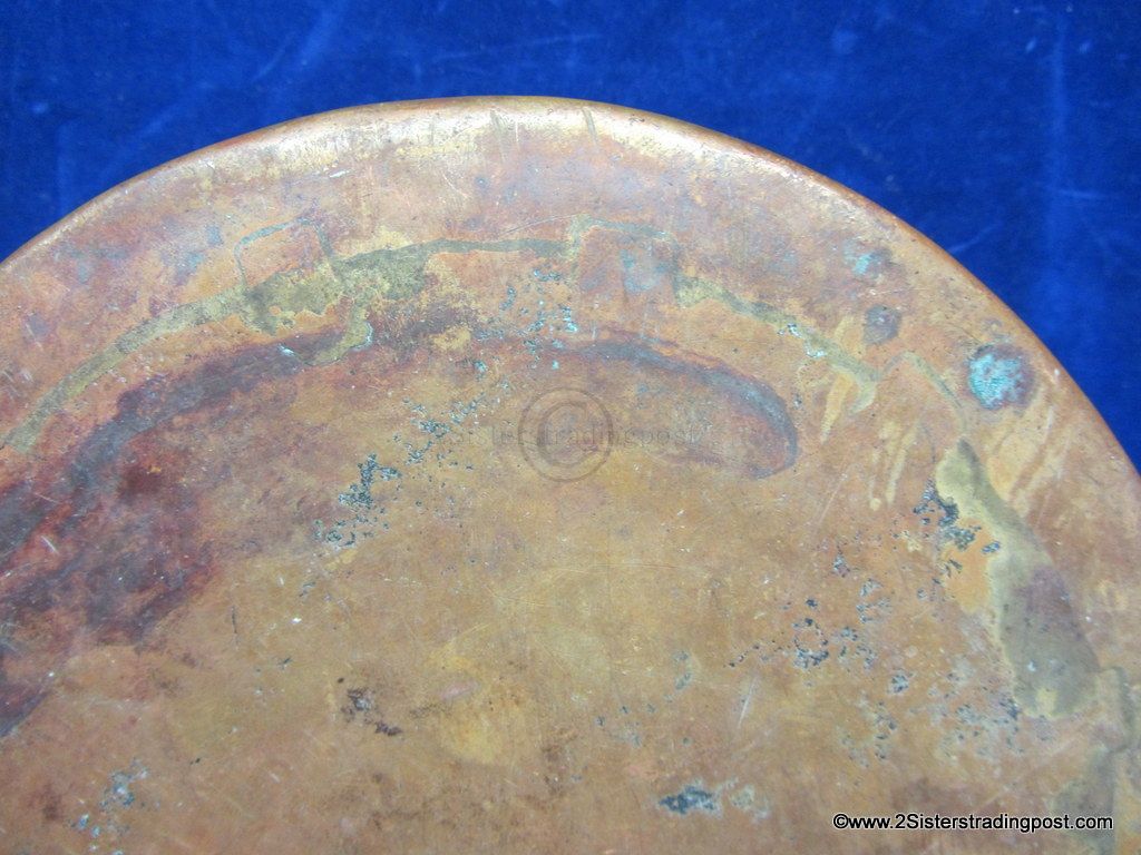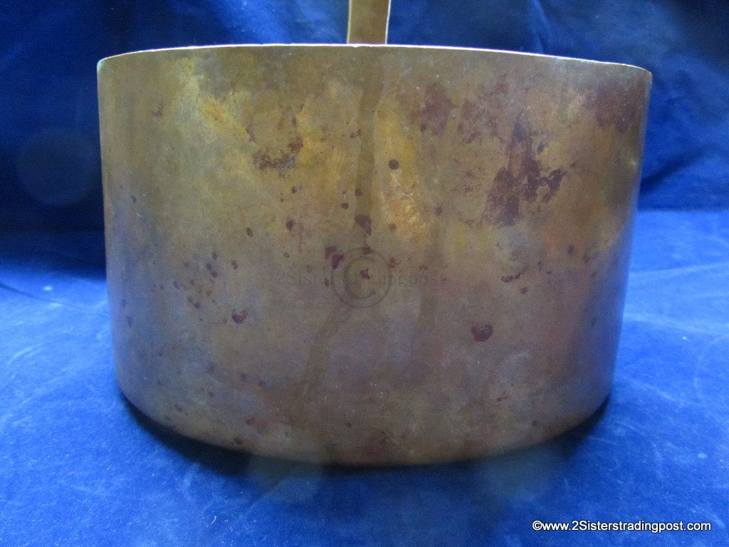 This Copper pot was hand hammered, has a rolled handle with a heart shaped joining plate where it attached to the pot.