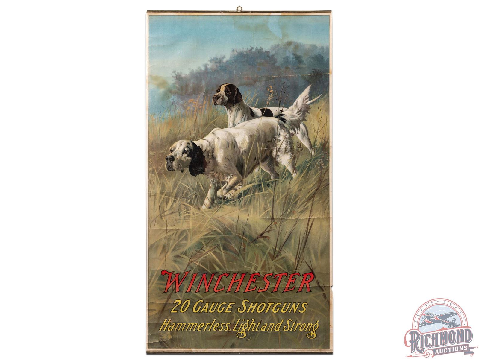 Iconic Winchester poster featuring a setter, pointer and reads "20 Gauge Shotguns, Hammerless, Light and Strong." Circa 1906-1907. Exhibits with good color and areas of creasing, tears, staining and loss. Retains top and bottom bands, possibly replacements. Shrink wrapped and secured to foamboard. Marked Winchester Repeating Arms Co. 30" H x 16.25" W.