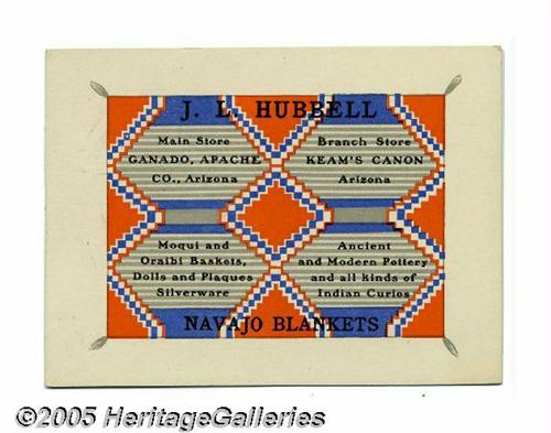 <B>Circa 1902 J. L. Hubbell Trade Card -- Navajo Blankets</B></I> John Lorenzo Hubbell was known as "Don Lorenzo" to the whites and "Old Mexican" or "Double Glasses" to the Navajos. He was the premier trader of Indian products and, for 50 years on the reservation, he was known for his honesty in business dealings, for his hospitality to travelers, and for his wise counsel to his friends the Navajos. During the course of his life, Hubbell built a trading empire that included freight and mail lines as well as trading posts. At various times, he and his family owned over thirty trading posts, two wholesale stores, curio shops and bean and apple farms. Without a doubt, he was one of the foremost Navajo traders of his time. Hubbell provided his Navajo customers with merchandise and food, while promoting Navajo arts and crafts to the remainder of the country. In many ways Hubbell served as a bridge between the Navajo and Anglo cultures, increasing understanding between the two. He once said, <I>"The first duty of an Indian trader, in my belief, is to look after the material welfare of his neighbors; to advise them to produce that which their natural inclinations and talent best adapts them; to treat them honestly and insist upon getting the same treatment from them...to find a market for their products and vigilantly watch that they keep improving in the production of same, and advise them which commands the best price..."</B></I> Offered here is a stunning trade card from the early 1900s advertising his stores in Ganado and Keam's Canon, Arizona. It has a colored background in a Navajo blanket design and promotes his business of selling "Morqui and Oraibi Baskets, Dolls and Plaques, Silverware, Ancient and Modern Pottery and all kinds of Indian Curios", 4" x 3" in size, mint condition. Excellent item. Lot:251
