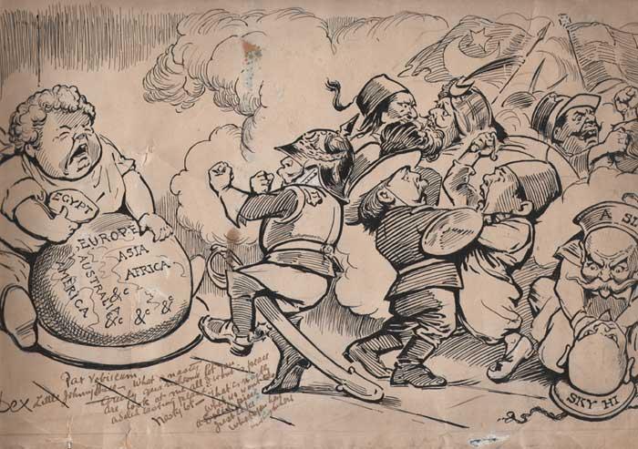 Henry-Campbell Bannerman seeing off Arthur Balfour on his funeral boat, mourned by Irish, "Scotish" and English "Toryism" and Edward Carson as the boat's prow. The second shows "Little Johnny Bull" grabbing a map of Egypt from a globe with various other nationalities fighting over territories. (2 items)