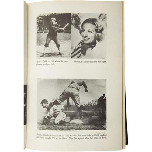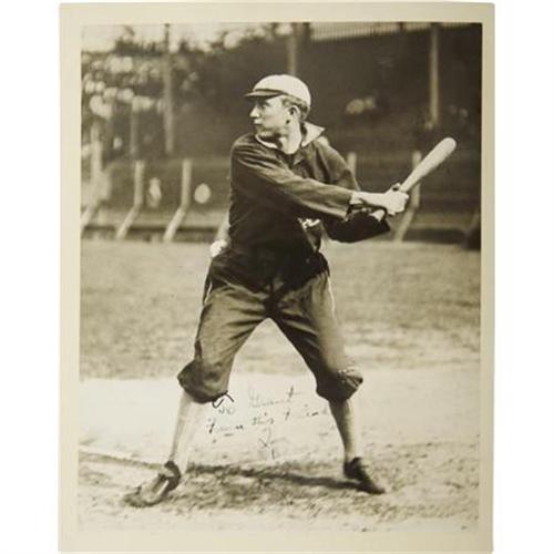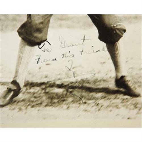 <B>Circa 1906 Ty Cobb Signed Photograph to Grantland Rice.</B></I> One early sporting legend sends his best regards to another. This exceptional century-old photograph of the Dead Ball Era's greatest superstar finds him at the infancy of his Major League career, with the white-collared navy jersey and pants he wears utilized only during Cobb's first two seasons (1905-06) in Detroit. The 7x9" image is inscribed to legendary sportswriter Grantland Rice, best remembered for naming the early 1920's Notre Dame backfield "The Four Horsemen of the Apocalypse," and other such grandiose journalistic phrasings. Rice should have checked his facts in this case however, as he captions the verso of this photograph, "The Georgia Peach playing semi-pro ball in Georgia at the age of 16." He repeats the mistake in his 1954 book <I>The Tumult and the Shouting, My Life in Sport,</B></I> which actually reproduces this very signed photo in the illustrated section at the center of the text. Perhaps it was from Cobb himself that he received the misinformation, but this is unquestionably an early Tigers photo, and perhaps the very earliest of Cobb in a batting posture.<BR><BR>The inscription to Rice is applied to the white area at the center of Cobb's wide batting stance. He writes, "To Grant, From His Friend, Ty." The ink maintains an average strength of 7/10, while any minor defects to the photo itself can only be spotted at certain angles to the light. By all accounts, this ancient print presents at a NRMT level. This "perfect storm" of condition, esteemed and rock-solid provenance, and status as perhaps the earliest signed Cobb image makes the offered lot one of the most significant autographed pieces from the Georgia Peach available in the hobby today. <I>LOA from PSA/DNA. LOA from James Spence Authentication.</B></I><BR><BR><b>Shipping:</b> Miscellaneous Collectibles, Larg (<a target="_blank" href="http://www.heritageauctions.com/common/shipping.php">view shipping information</a>)