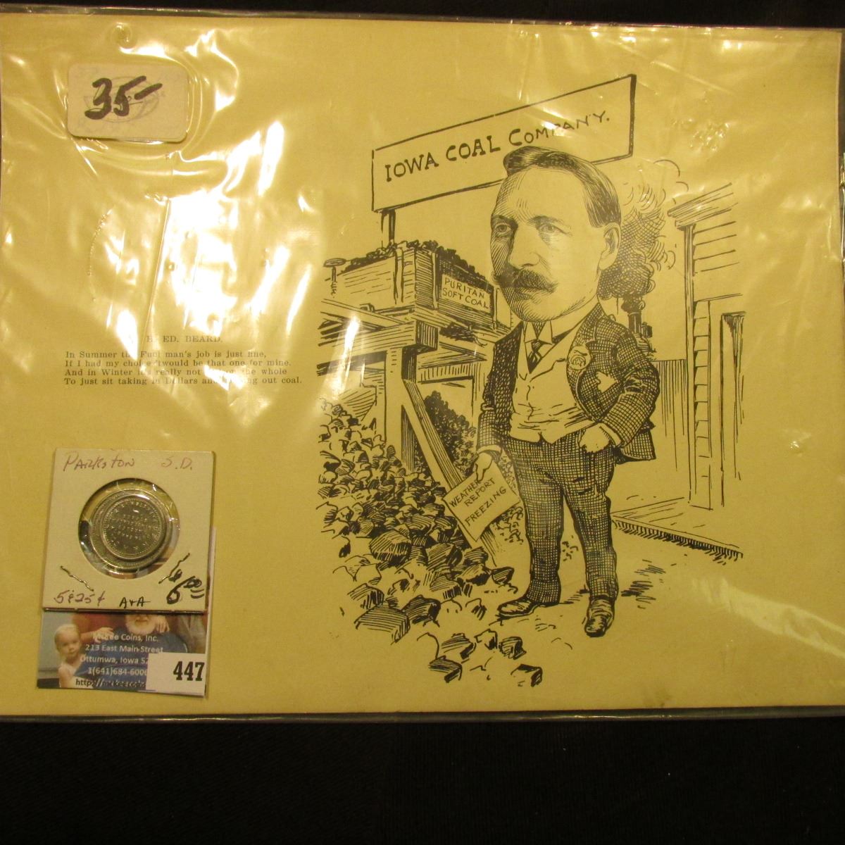 Circa 1910 Des Moines Co., Iowa 9" x 11" Advertising card "C.E. Gerling, Eminent Ruler, Burlington Elks. He's a big Elk Chief. "Wow, Wow." He greets you by saying, "How, How." He's a Medicine Man for sure, His tribe's bum eyes he can cure. Even when they are crossed They won't give they up for lost, For he can twist them around and inside out, Till they are tickeld to death without a doubt. They say "I should worry" won't apply to you, When with your eyes he is quite through."; & a group of 1975 John Deere VIP Auction Money, J.D. Chairman, Hewitt;s Home. 'Doc' sold these for $4.00 each.