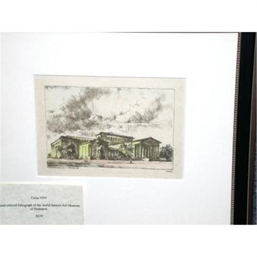 Hand colored lithograph of the world famous Art Museum of Budapest cica 1910. very little discoloration and in excellent conditon. Framed behind glass on acid free matting and paper. Litho measures 6.0" x 4.0" and frame is 11.0" x 10.0"