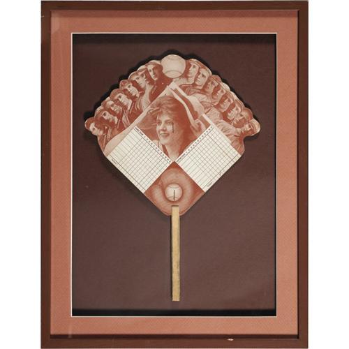 <B>Circa 1910 Major League Managers Scorecard Fan .</B></I> Magnficent die-cut rarity served the dual purpose of keeping score and keeping cool, though the former was never utilized. An attractive female baseball fan and an image of a ball and glove command the lower portion of the design where the scorecards are placed, while players and managers from the sixteen Major League clubs are ranged along the upper edges. Notables include Hall of Famers Bresnahan, Clarke (misspelled "Clark" here), Chance, Griffith, Lajoie and Wallace, as well as disgraced Dead Ball legend Hal Chase. Mild to moderate wear brushes the tops of the die-cut figures, though this example is far superior than the vast majority of the small surviving supply. The body of the fan measures approximately 9x10", not including the original wooden stick, which is still affixed with ancient staples. The piece is gorgeously matted and framed in complementary colors to a final size of 16x20". <BR><BR><B>Important notice:</B> Heritage usually auctions material at the rate of 200-250 lots per hour. On some occasions eBay Live bid software or the Internet may not be able to keep up with the pace of the auction. We recommend placing a realistic absentee bid now as insurance to avoid disappointment. Occasionally the auctioneer may eliminate or reject an eBay Live bid, and the auctioneer may also reopen a lot after the close of the eBay live bidding (usually because we missed an audience bid), and may reject your bid even if it shows you as the winning bidder. By bidding via eBay Live, you agree that Heritage may award the lot to another bidder at its sole discretion under the circumstances described above or any other reasonable circumstances. Since eBay bids are not shown to us until we open the lot on the floor, we treat those bids just like floor bids. In most cases the floor responds before the eBay bid is presented to us, due to Internet lag time, so for consistency we have made it a policy that floor bids are always considered first over tie eBay live bids. Also please note that all Heritage lots purchased through eBay Live carry a 22.5% Buyer's Premium. Please make sure you read the Terms and Conditions before you bid. This lot is being auctioned in conjunction with a live floor auction by Heritage Galleries & Auctioneers. All final auction and invoice information will be supplied by Heritage Galleries & Auctioneers, and all other information should be considered preliminary. Lot:19504 <BR><BR><B>Winning Notification and Billing:</B> After the FINAL session in this auction is complete, Heritage will send e-mail and snail mail invoices. This process normally takes several days. All final auction and invoice information will be supplied by Heritage Galleries & Auctioneers, and all other information should be considered preliminary. <BR><BR>This auction will be conducted on a live auction floor and over the Internet through eBay Live. If you choose to place an absentee bid, please take a moment to <font color='#0000ff'><u><a href='http://pages.ebay.com/liveauctions/help/before/laabsentee.html'>learn how eBay Live absentee bidding works</a></u></font><font color='#000000'>