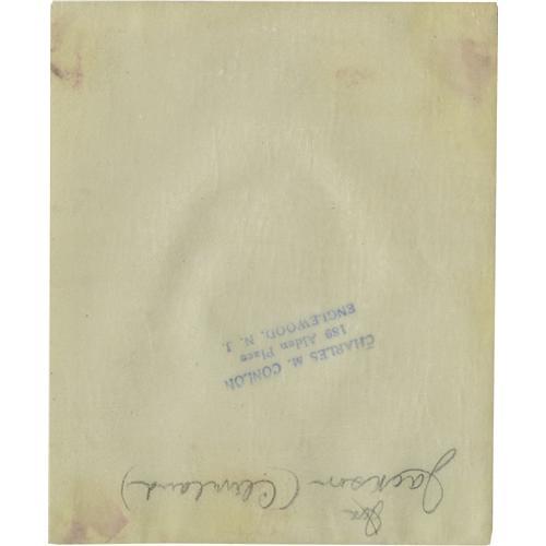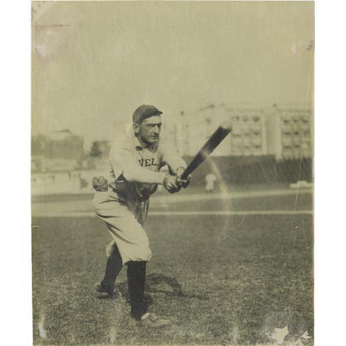<B>Circa 1914 Joe Jackson Photograph by Conlon, Type 1.</B></I> The young superstar from Pickens County, Georgia displays the batting style that Babe Ruth himself chose to emulate. Razor sharp clarity and perfect contrast are what we have come to expect from the famed Charles Conlon, whose photos of early twentieth century baseball have become the official visual record of the game. Conlon's stamp appears on verso of this 4x5" shot of Shoeless Joe in a Cleveland Naps uniform. Small patches of wear at the corners have no effect upon this spectacular image.