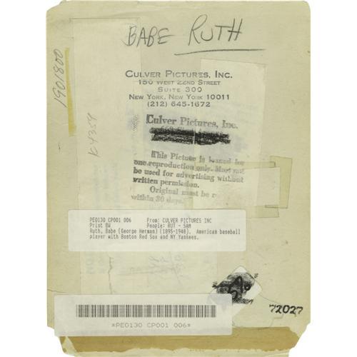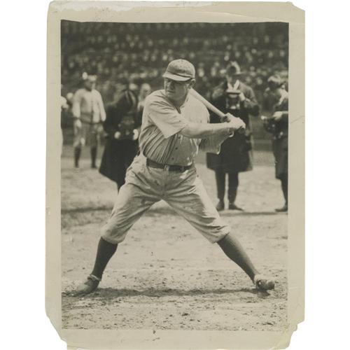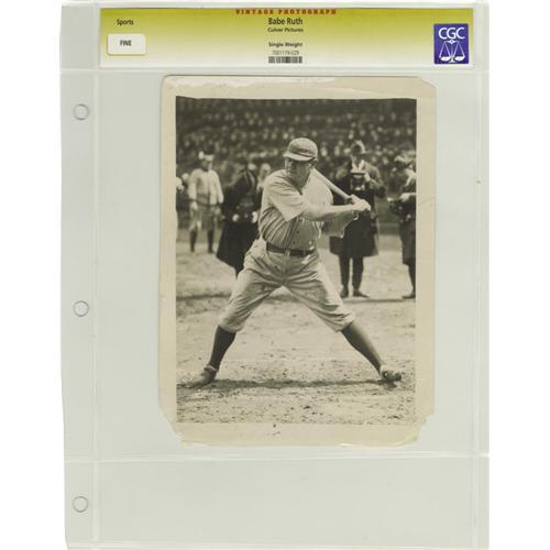 <B>Circa 1918 Babe Ruth Culver Service Photograph, Type 1.</B></I> The Babe's somewhat awkward batting stance is to be forgiven--after all, he was just a pitcher at the time this photo was snapped. Spectacular action shot of Ruth in Boston Red Sox uniform is one of just a tiny handful known to exist. Wear is confined almost completely to the wide white borders, leaving the image area to present as all but flawless. "Culver Pictures" stamping on verso. 6x8". Confirmed as "Type 1" by PSA/DNA. CGC grade: Fine.