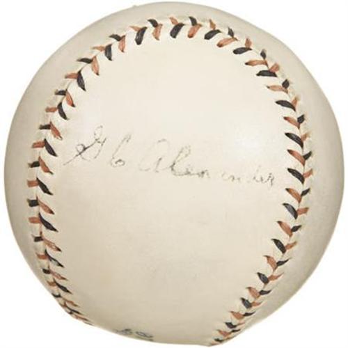 <B>Circa 1920 Grover Cleveland Alexander Signed Baseball.</B></I> The slanted "Cork Center" words that frame the Official National League stamping of the offered sphere allow us to pin the manufacturing date to the period between 1914 and 1925, ensuring that the Alexander signature it houses is of "playing days" variety. As tough as it is to find Old Pete on any baseball whatsoever, those that do arise are typically the result of his later barnstorming activities, making this piece all the more scarce and desirable. As a legitimate "single," the price tag for this ball would be off the charts, but the lovely 6/10 black fountain pen autograph was once joined by several others which have been expertly removed by a chemical process to leave not even a pale ghost of their former presence. Those trying to complete a run of singles from the Hall of Fame's inaugural class will find this troubled but brilliant right-hander to be the toughest by far, so expect some real competition when this ball reaches the auction block. <I>LOA from PSA/DNA. LOA from James Spence Authentication.</B></I><BR><BR><b>Shipping:</b> Balls, Pucks, etc., Small (<a target="_blank" href="http://www.heritageauctions.com/common/shipping.php">view shipping information</a>)