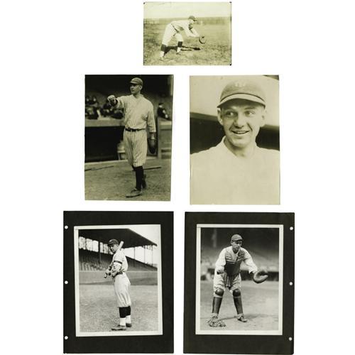 <B>Circa 1920 New York Yankees Photographs Lot of 6 from the Herold "Muddy" Ruel Collection.</B></I> Direct from the archives of Muddy himself comes a half dozen images of the star catcher in pinstripes. All are quality first-generation vintage images, the best of which bears the stamping of noted shutterbug Charles M. Conlon on verso. Three photos are affixed to a pair of scrapbook pages, but could be easily removed if desired. Condition ranges from a technical (but much better looking) VG to EX-MT, though all could be matted and framed to great effect. Size ranges from 4.75x6.75" to 6.75x10", with most on the larger end of that scale. Letter of provenance from Muddy's son is included. <BR><BR><B>Important notice:</B> Heritage usually auctions material at the rate of 200-250 lots per hour. On some occasions eBay Live bid software or the Internet may not be able to keep up with the pace of the auction. We recommend placing a realistic absentee bid now as insurance to avoid disappointment. Occasionally the auctioneer may eliminate or reject an eBay Live bid, and the auctioneer may also reopen a lot after the close of the eBay live bidding (usually because we missed an audience bid), and may reject your bid even if it shows you as the winning bidder. By bidding via eBay Live, you agree that Heritage may award the lot to another bidder at its sole discretion under the circumstances described above or any other reasonable circumstances. Since eBay bids are not shown to us until we open the lot on the floor, we treat those bids just like floor bids. In most cases the floor responds before the eBay bid is presented to us, due to Internet lag time, so for consistency we have made it a policy that floor bids are always considered first over tie eBay live bids. Also please note that all Heritage lots purchased through eBay Live carry a 22.5% Buyer's Premium. Please make sure you read the Terms and Conditions before you bid. This lot is being auctioned in conjunction with a live floor auction by Heritage Galleries & Auctioneers. All final auction and invoice information will be supplied by Heritage Galleries & Auctioneers, and all other information should be considered preliminary. Lot:19439 <BR><BR><B>Winning Notification and Billing:</B> After the FINAL session in this auction is complete, Heritage will send e-mail and snail mail invoices. This process normally takes several days. All final auction and invoice information will be supplied by Heritage Galleries & Auctioneers, and all other information should be considered preliminary. <BR><BR>This auction will be conducted on a live auction floor and over the Internet through eBay Live. If you choose to place an absentee bid, please take a moment to <font color='#0000ff'><u><a href='http://pages.ebay.com/liveauctions/help/before/laabsentee.html'>learn how eBay Live absentee bidding works</a></u></font><font color='#000000'>