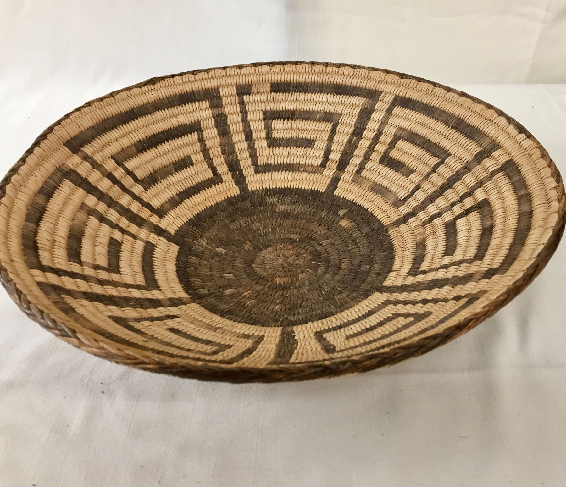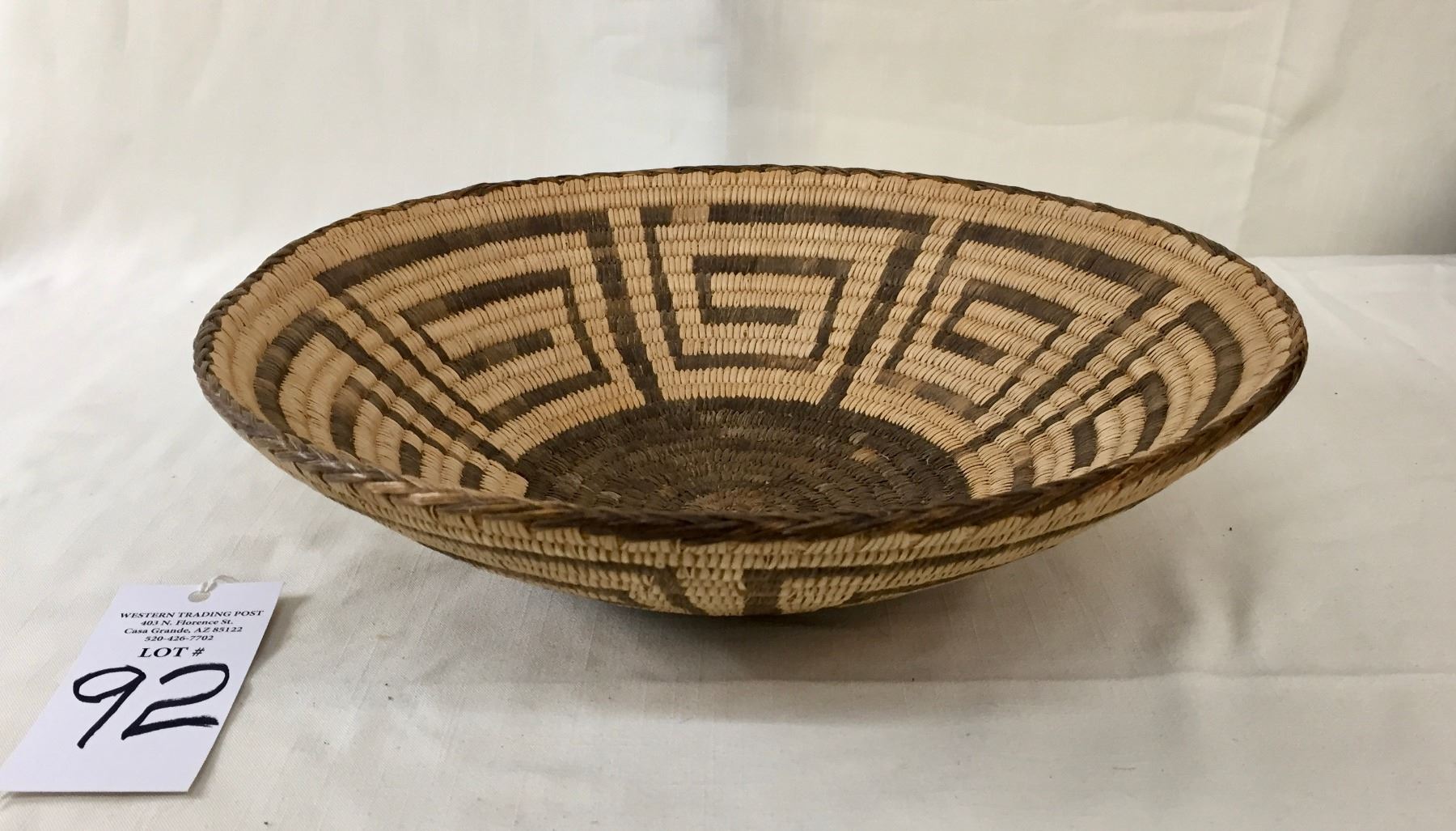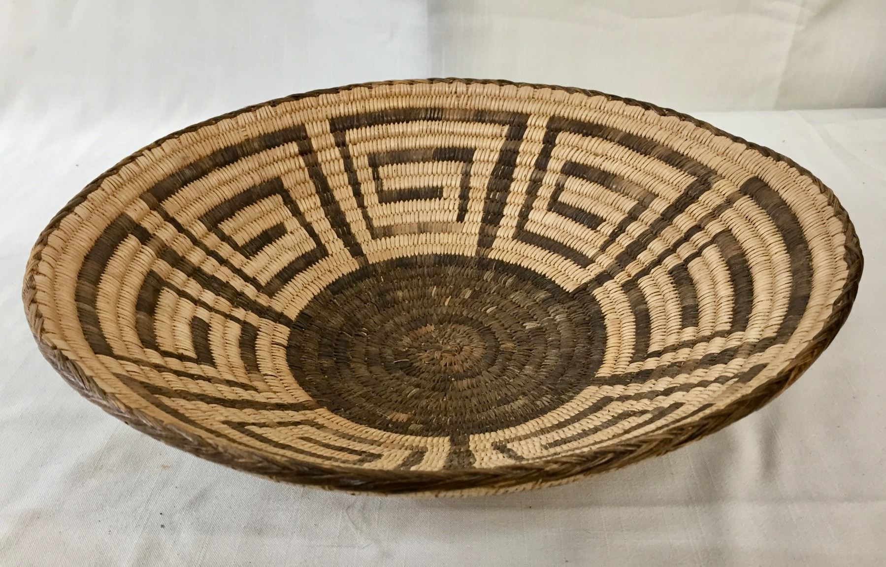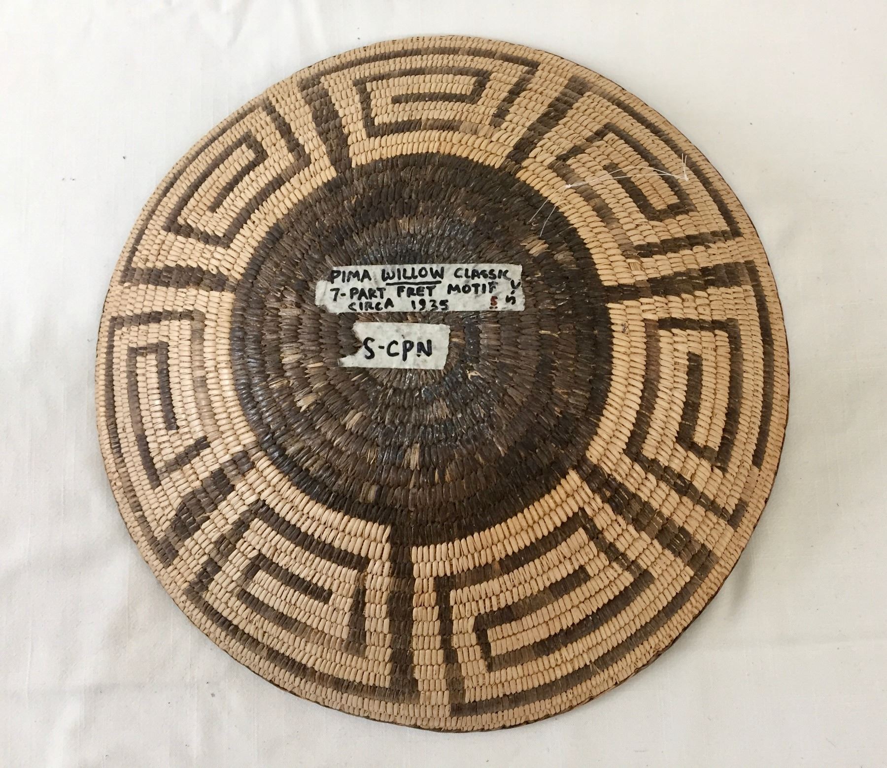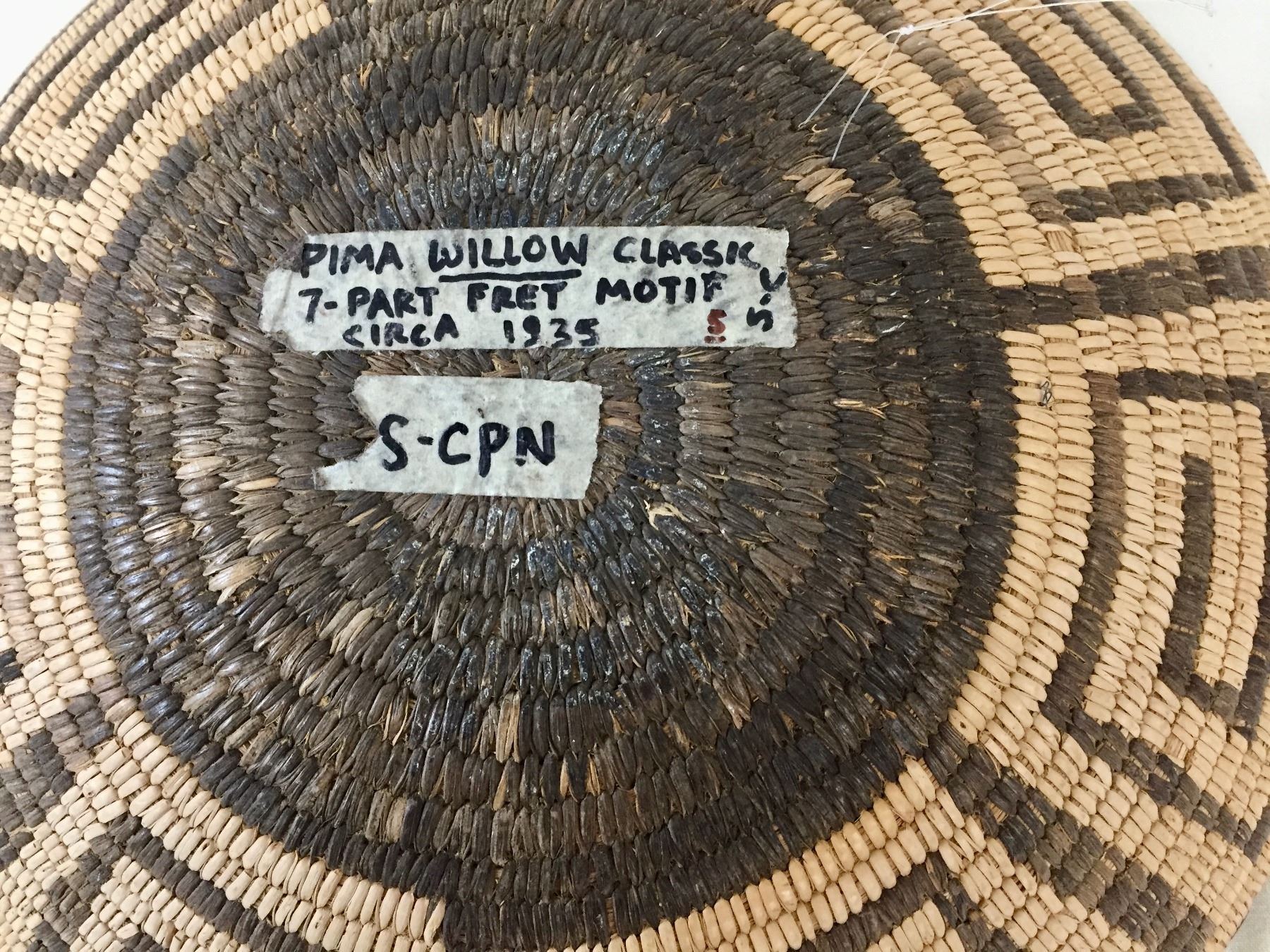 Description: For your enjoyment we offer this beautiful, tightly woven Pima Basket featuring geometrical designs. Made with willow and devils claw materials on a grass bundle foundation. Maker: Unknown Pima artist.