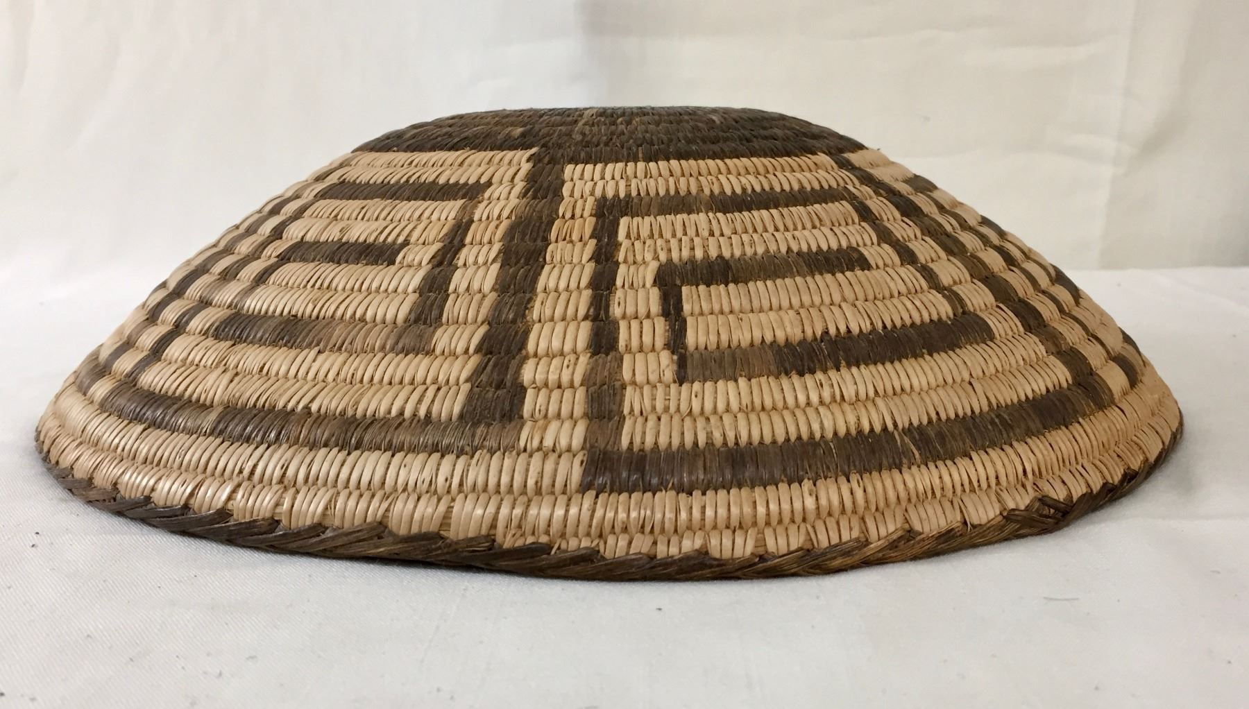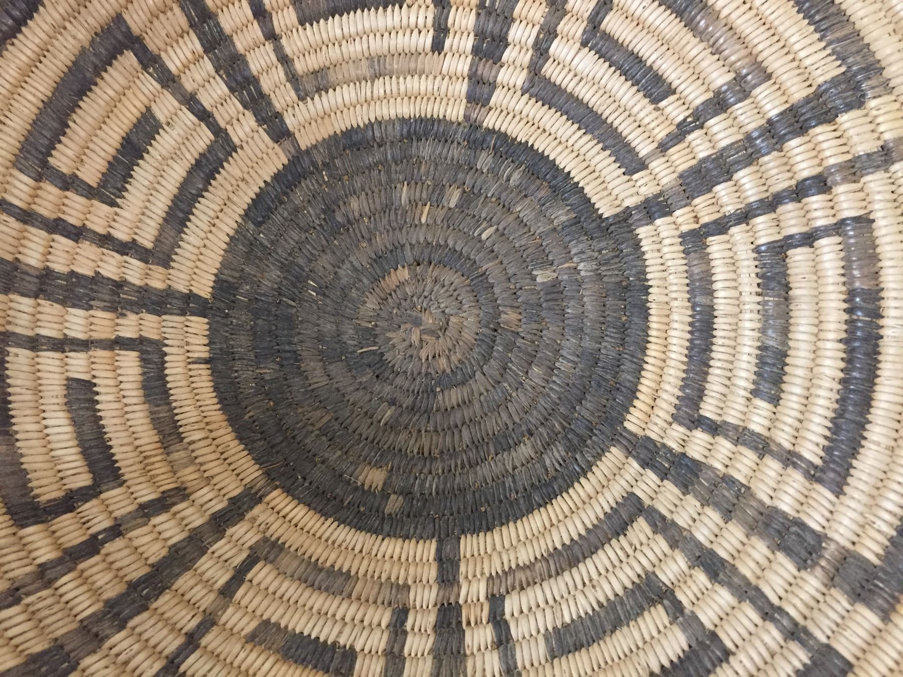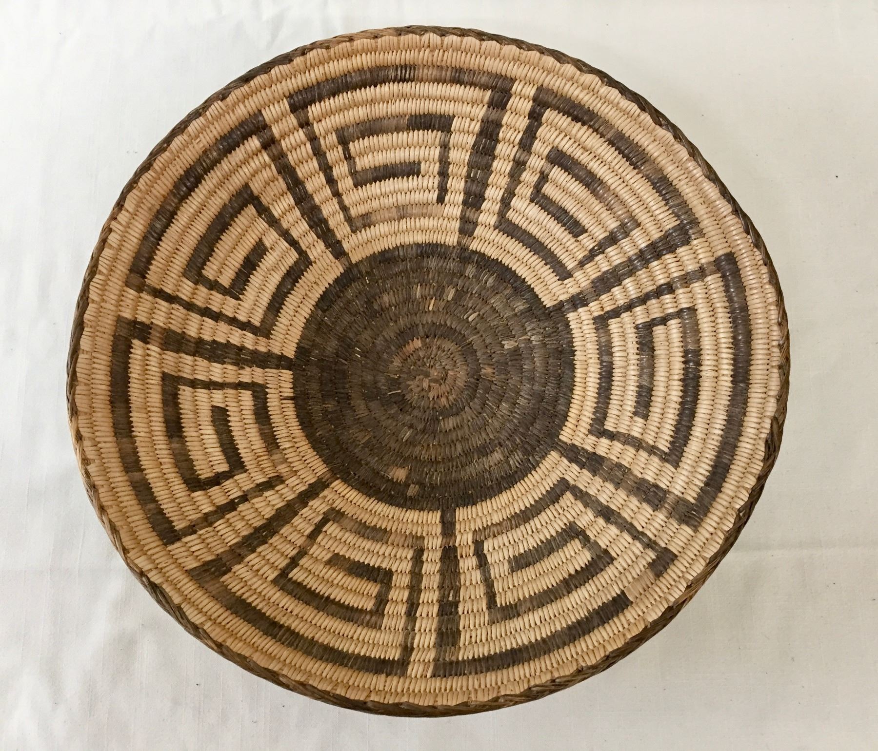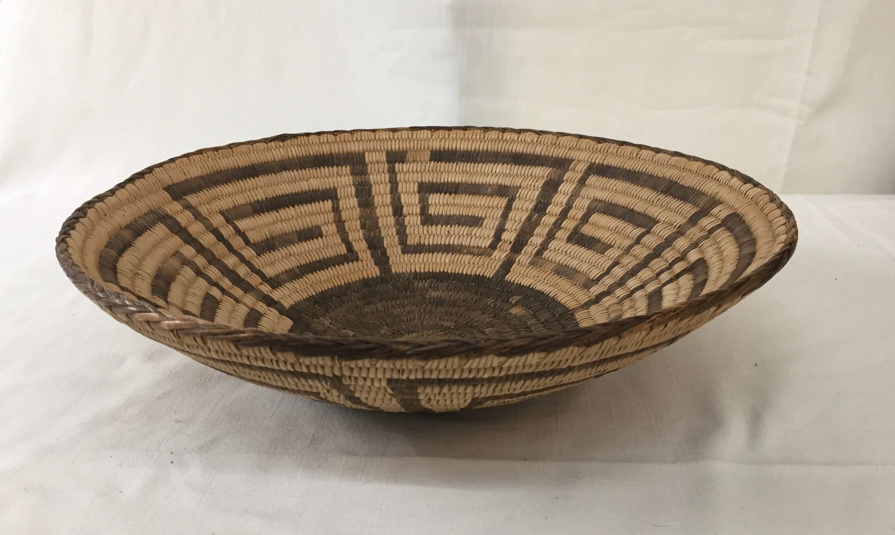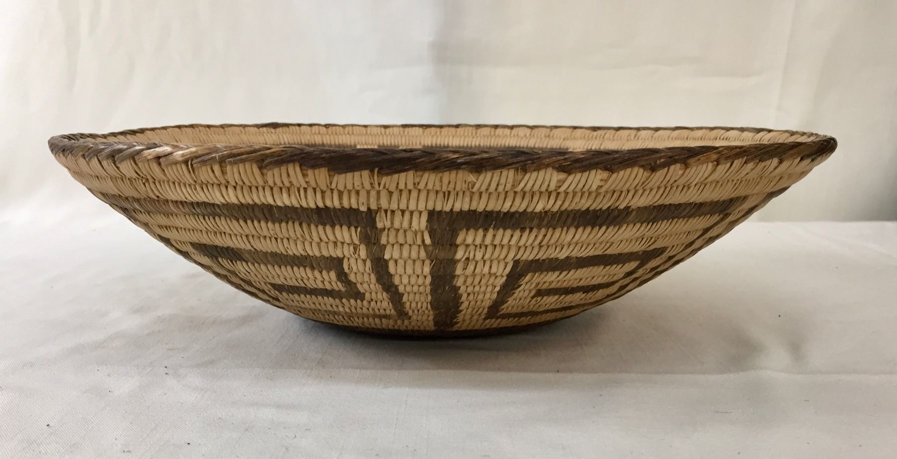 Description: For your enjoyment we offer this beautiful, tightly woven Pima Basket featuring geometrical designs. Made with willow and devils claw materials on a grass bundle foundation. Maker: Unknown Pima artist.