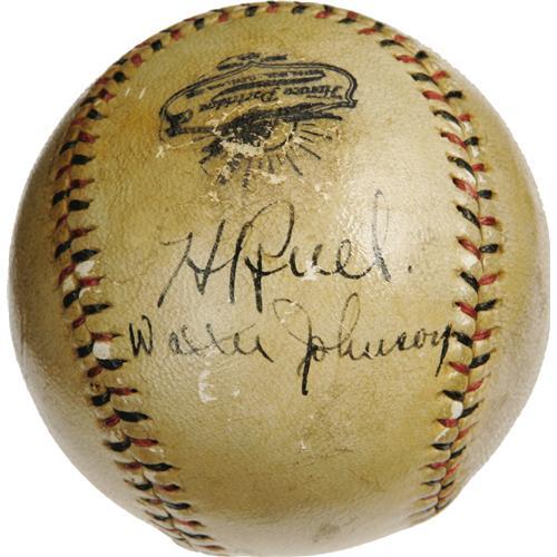 <B>Circa 1924 Walter Johnson & Muddy Ruel Signed Baseball.</B></I> An absolute dream piece for the serious 1920's baseball collector, especially those with a fondness for the defunct Washington Senators franchise. This astounding rarity celebrates the esteemed battery that earned the long-suffering ballclub from our nation's capital its one and only World Championship in 1924. Though Johnson is clearly the more recognizable figure of the two in baseball lore, the Hall of Famer was very vocal in crediting Ruel with his rebirth as a top-tier pitcher when everyone, including himself, thought his best days were behind him. And in fact, it was the diminutive catcher who plated the winning run in the bottom of Game Seven's twelfth inning to secure for Johnson his only Series victory. As such, these two will be forever linked, as they are here upon the side panel of a "Partridge Official Major League" baseball. Each has signed in the same bold black fountain pen ink, rating nothing less than 9/10 eight decades after their application. A thin coating of ancient shellac is largely to thank for the remarkable condition of the autographs, and has supplied the sphere with an attractive vintage patina. Certainly a one-of-a-kind artifact, destined for the finest of private collections. <I>LOA from PSA/DNA. LOA from James Spence Authentication.</B></I><BR><BR><b>Shipping:</b> Balls, Pucks, etc., Small (<a target="_blank" href="http://www.heritageauctions.com/common/shipping.php">view shipping information</a>)