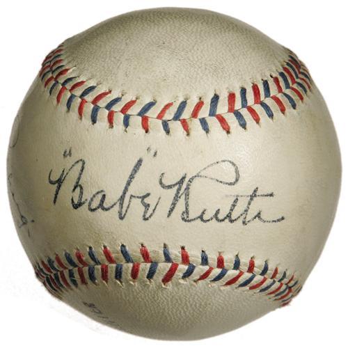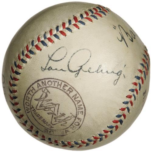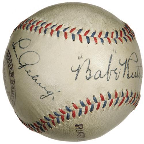 <B>Circa 1927 Babe Ruth & Lou Gehrig Signed Baseball.</B></I> What adjective could possibly do justice to this one? In fact, we're tempted to forgo descriptive text entirely, since any attempt to convey the magnificence of this dual-signed sphere would fail to be anything more than a statement of the obvious. Just look at the photos. Clearly this ranks among the few finest baseballs signed by the most important of Yankee duos ever to reach the auction block.<BR><BR> The Mint condition in which this Worth Official League ball finds itself a full eight decades after its brush with greatness could be attributed to a long and lonely life sequestered in its original box, which remains to this day in likewise magnificent shape. Affixed to two panels of the box are newspaper clipping photographs announcing a visit from the "Bustin' Babes" and "Larrupin' Lous," the barnstorming squads headed by the twin heroes of the 1927 season that toured the country following the Yanks' four-game Series sweep. This unimprovable vintage could be considered yet another layer of icing on this most delectable of cakes.<BR><BR> Ruth's sweet spot signature offers the desirable "quotation mark" style that characterizes his early autograph, and Gehrig's to the left is the dignified, carefully rendered model that collectors crave. Again, each has maintained the identical boldness of its original application. The hide of the ball has mellowed half a shade at best, only adding to the exceptional aesthetic appeal of this treasure. Even the red and blue stitching reminds us of the OAL balls that were in vogue at the time.<BR><BR> Opportunities to own such a pristine example of this important baseball have become ever more uncommon with each passing year, and prices continue to climb. The conventional wisdom to "invest in quality" is conventional wisdom for a reason. We suspect that the winning bidder of this lot will remember this in the future as one of his smartest buys. <I>LOA from PSA/DNA. LOA from James Spence Authentication.</B></I><BR><BR><b>Shipping:</b> Balls, Pucks, etc., Small (<a target="_blank" href="http://www.heritageauctions.com/common/shipping.php">view shipping information</a>)
