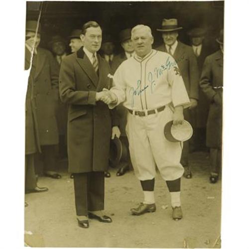 <B>Circa 1927 John McGraw Signed Photograph.</B></I> The third and final autographed photo consigned by the niece of Joe Glassenberg, who served as bat boy for the New York Yankees from 1926 through 1928. Though Joe does not appear in this "Pacific & Atlantic Photos" wire image, and the dimensions are a more standard 7.5x9.5", the theme of flawless ink quality that characterizes the Ruth and Gehrig photos is continued here as well, with the Hall of Fame Giants manager applying the boldest of blue fountain pen across his chest. Mugsy shakes the hand of an unidentified gentleman in this image rendered with sharp contrast and detail, his hair white from the stresses of a quarter century at the Giants' helm. Some wear to the edges of the image must be noted, most notably a corner chip at upper right that has been secured with clear tape, though a simple matting job would easily provide a NRMT appearance with no loss to the central focus. A tough and very desirable signed image absent from most Hall of Fame autograph collections. <I>LOA from PSA/DNA. LOA from James Spence Authentication.</B></I><BR><BR><b>Shipping:</b> Flat Material, Small (<a target="_blank" href="http://www.heritageauctions.com/common/shipping.php">view shipping information</a>)