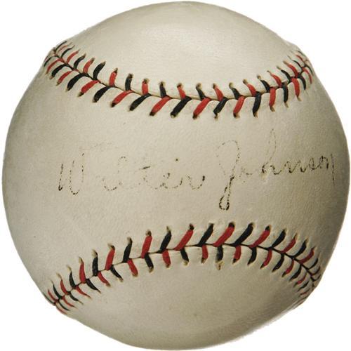<B>Circa 1927 Walter Johnson Single Signed Baseball.</B></I> This particular style of red and black stitched ONL (Heydler) ball was manufactured only between 1926 and 1932, leading us to conclude that it was likely signed during one of the final two seasons of The Big Train's Hall of Fame career. Seasoned collectors understand how scarce Johnson singles are, and that the small available supply tends to date from his post-playing years, so excitement over this offering is certainly well justified. The black fountain pen sweet spot signature has mellowed somewhat to a conservative rating of 7/10, and the ball itself remains wonderfully clean and just a half tone from pure white. One of the most desirable Johnson solos to reach the hobby in recent memory. <I>LOA from PSA/DNA. LOA from James Spence Authentication.</B></I><BR><BR><b>Shipping:</b> Balls, Pucks, etc., Small (<a target="_blank" href="http://www.heritageauctions.com/common/shipping.php">view shipping information</a>)