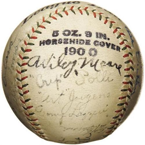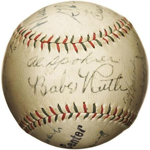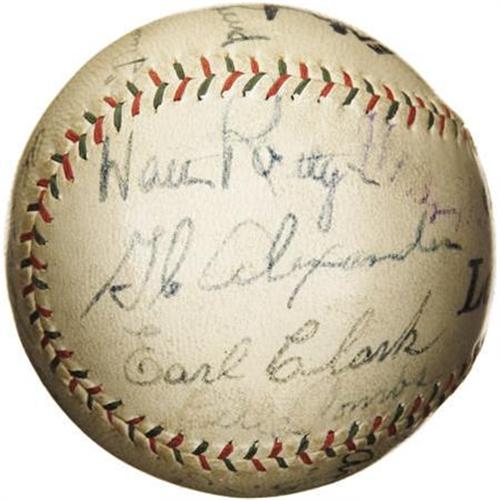 <B>Circa 1929 Babe Ruth, Lou Gehrig & G.C. Alexander Signed Baseball.</B></I> We can't quite solve the riddle of this baseball, as our initial theory that the presence of the three Hall of Famers listed in the auction lot title would suggest 1926 or 1928 World Series vintage was derailed by others who arrived on the Major League scene afterwards. But while the origins remain in question, the tremendous appeal does not. The Ruth signature upon the sweet spot of the "Official League Ball" would make for a $15,000 single in its 8/10 condition, and his sidekick Gehrig is equally strong on the southern panel. The very tough Grover Cleveland Alexander resides to the north of the Babe, projecting at an even more impressive 9/10. Other notables include Combs (3/10), Dickey (9/10), Lazzeri (6/10) and Wilcy Moore (8/10). Eighteen autographs are here in total, with the average a solid 6/10. A fine chance to bring some qualiity pre-war Hall of Fame autographs into your collection. <I>LOA from PSA/DNA. LOA from James Spence Authentication.</B></I><BR><BR><b>Shipping:</b> Balls, Pucks, etc., Small (<a target="_blank" href="http://www.heritageauctions.com/common/shipping.php">view shipping information</a>)